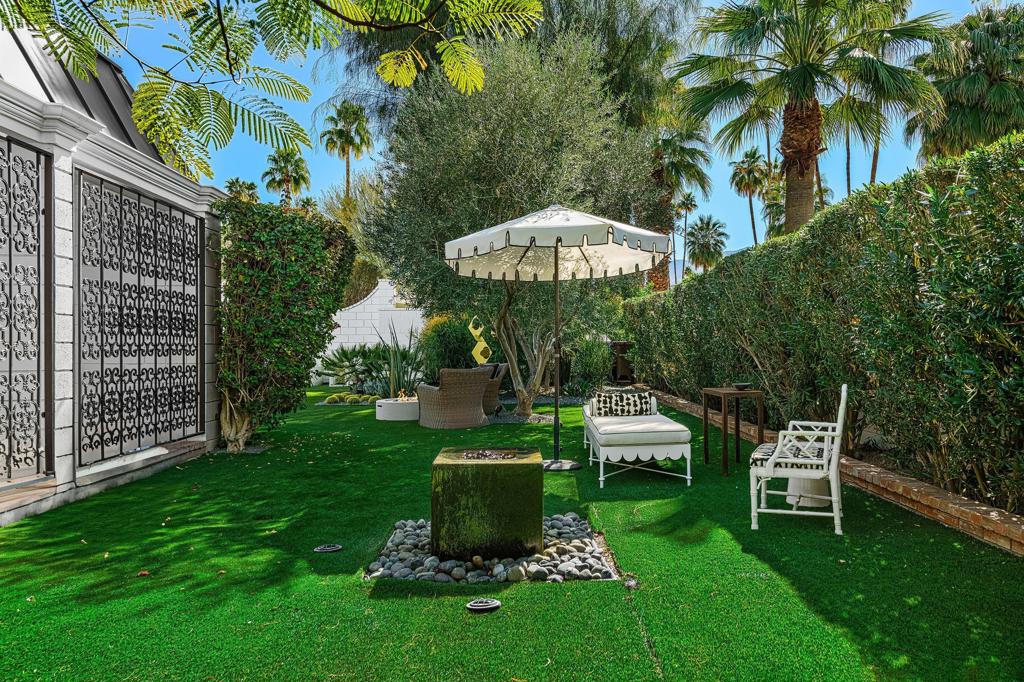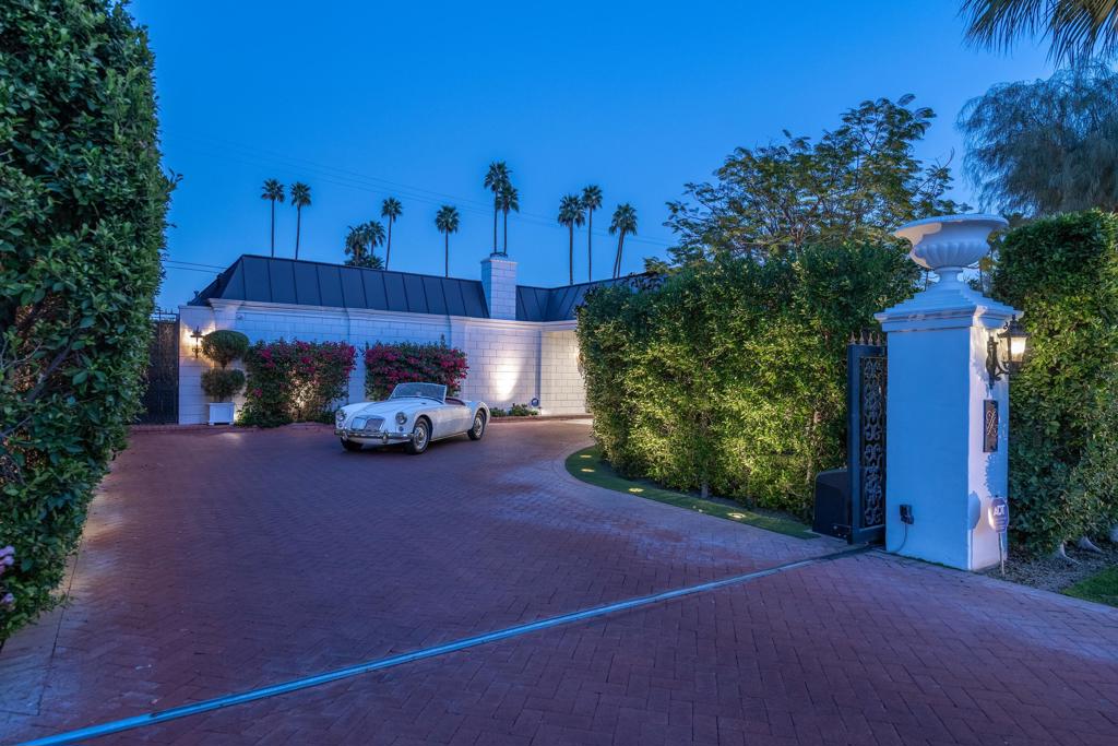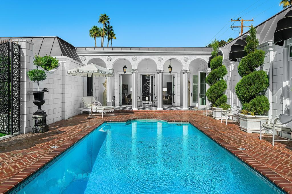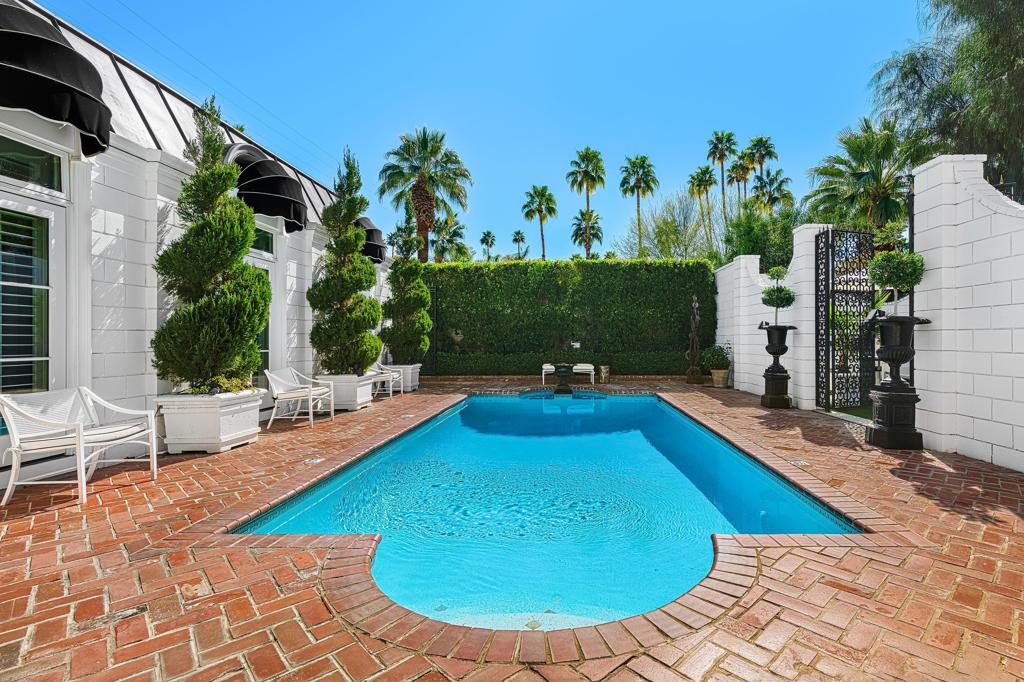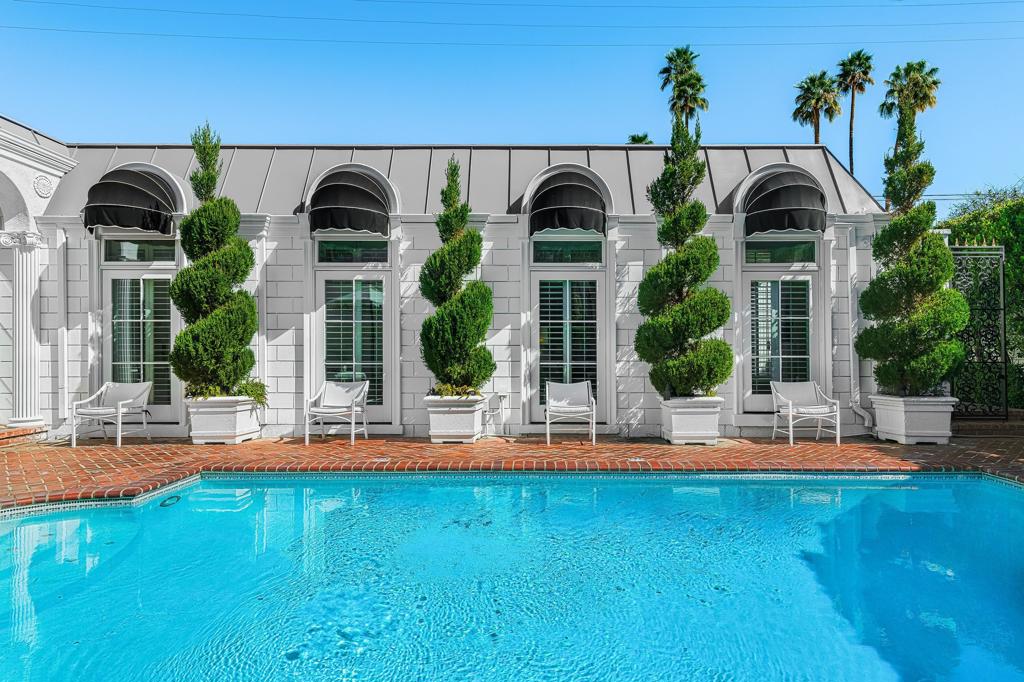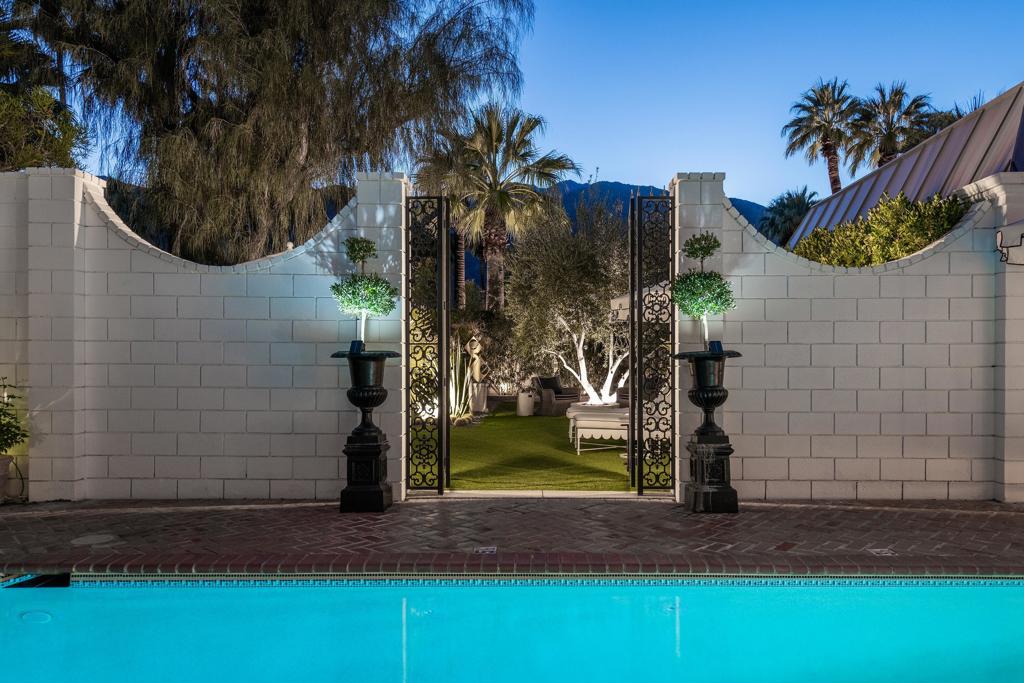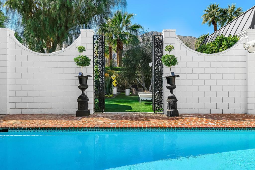 Introducing 'La Petite Maison', a glamorous 3 bed / 3 bath Hollywood Regency style home inspired by John Elgin Woolf.Exuding elegance and sophistication, legend has it that Liberace commissioned this one-of-a-kind residence for his mother Frances.Lovingly restored & upgraded with a warm and inviting feel throughout. Features include black & white marble floors, high ceilings, French doors, and smart home technology. The stunning living room includes a gas fireplace, original crystal chandelier, heated floors, surround sound speakers, custom millwork and access to the pool courtyard. The spacious dining room is perfect for entertaining. The dramatic and renovated black & white service kitchen includes new Kitchen Aid appliances including two dishwashers, an induction cooktop, and integrated microwave/convection wall oven.The spacious primary bedroom boasts a soaker tub, steam shower, heated bathroom floors, vintage lighting from Paris & outdoor shower with views of the San Jacinto mountains. Two guest rooms each have their own en-suite bath.Outside, a private salt-water pool and estate-like lush garden offer views of the San Jacinto Mountains. Elegant garden gates provide access to a desert oasis: sunny and quiet, with solid hedging, mature trees, a fire pit and water fountain. The rear patio features a charming al fresco setting for outdoor dining.This especially rare piece of Palm Springs history must be seen in person to be truly appreciated.
