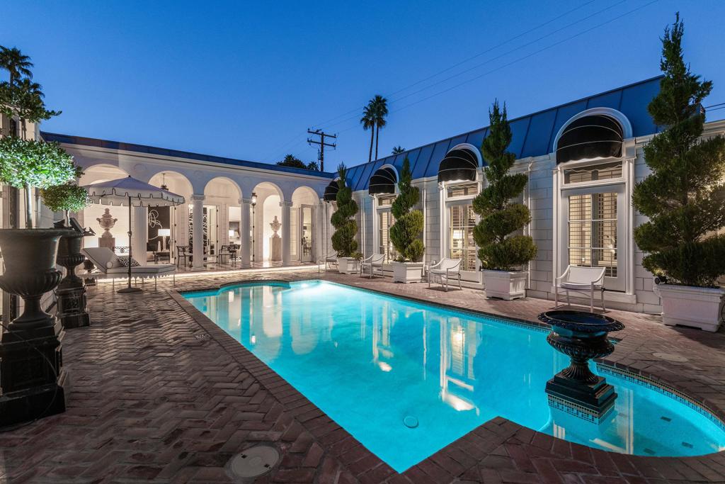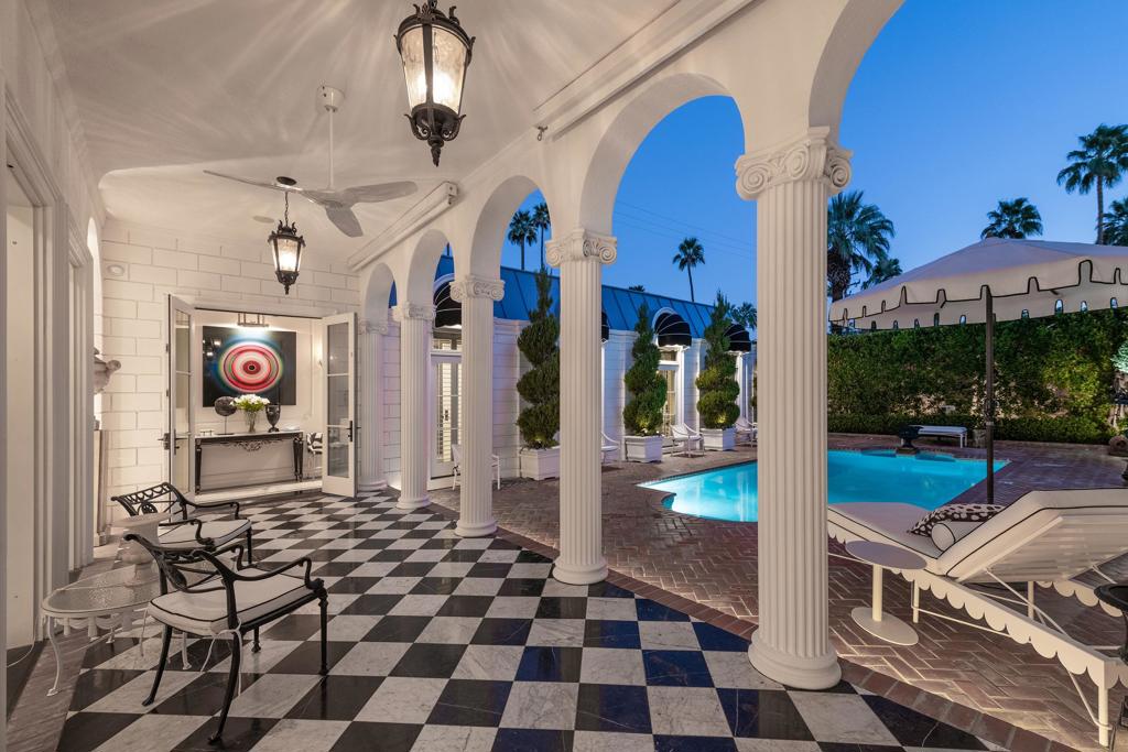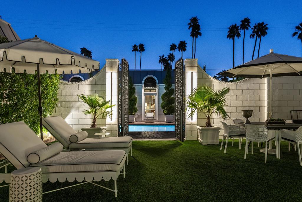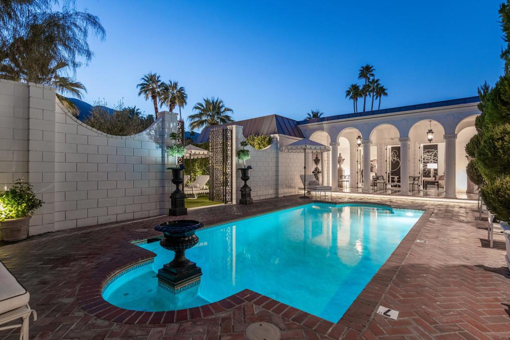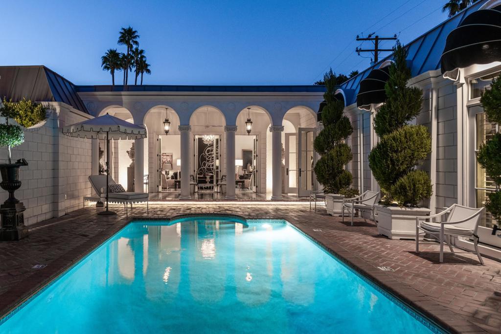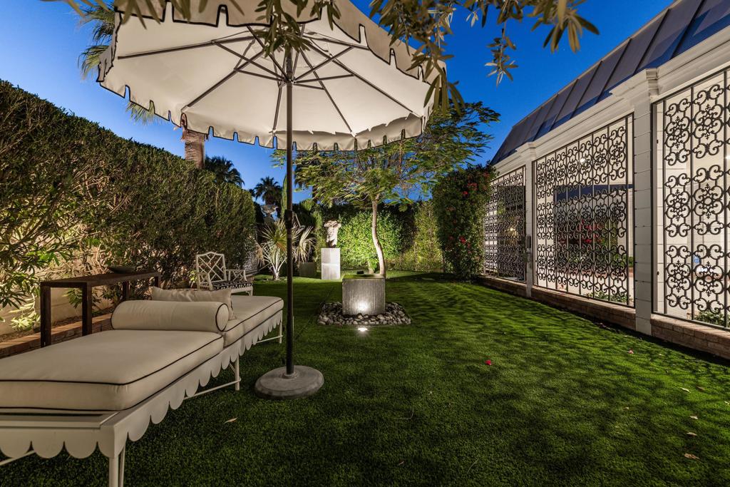 Introducing 'La Petite Maison', a glamorous 3 bed / 3 bath Hollywood Regency style home inspired by John Elgin Woolf.Exuding elegance and sophistication, legend has it that Liberace commissioned this one-of-a-kind residence for his mother Frances.Lovingly restored & upgraded with a warm and inviting feel throughout. Features include black & white marble floors, high ceilings, French doors, and smart home technology. The stunning living room includes a gas fireplace, original crystal chandelier, heated floors, surround sound speakers, custom millwork and access to the pool courtyard. The spacious dining room is perfect for entertaining. The dramatic and renovated black & white service kitchen includes new Kitchen Aid appliances including two dishwashers, an induction cooktop, and integrated microwave/convection wall oven.The spacious primary bedroom boasts a soaker tub, steam shower, heated bathroom floors, vintage lighting from Paris & outdoor shower with views of the San Jacinto mountains. Two guest rooms each have their own en-suite bath.Outside, a private salt-water pool and estate-like lush garden offer views of the San Jacinto Mountains. Elegant garden gates provide access to a desert oasis: sunny and quiet, with solid hedging, mature trees, a fire pit and water fountain. The rear patio features a charming al fresco setting for outdoor dining.This especially rare piece of Palm Springs history must be seen in person to be truly appreciated.