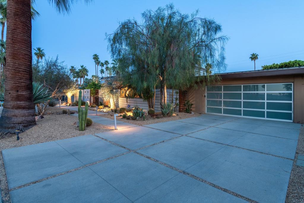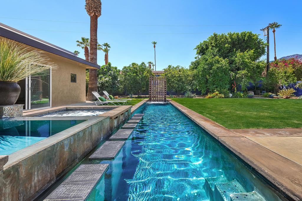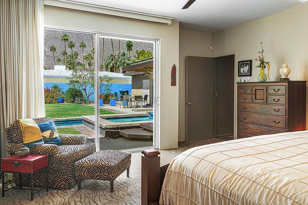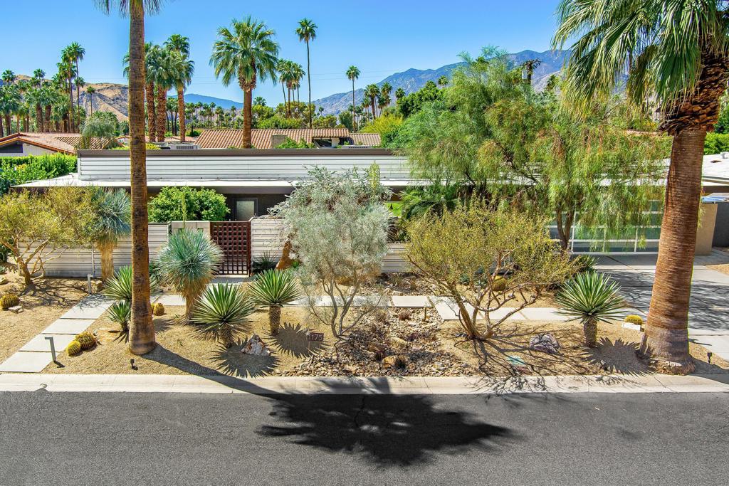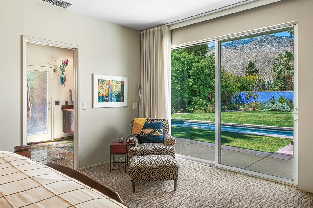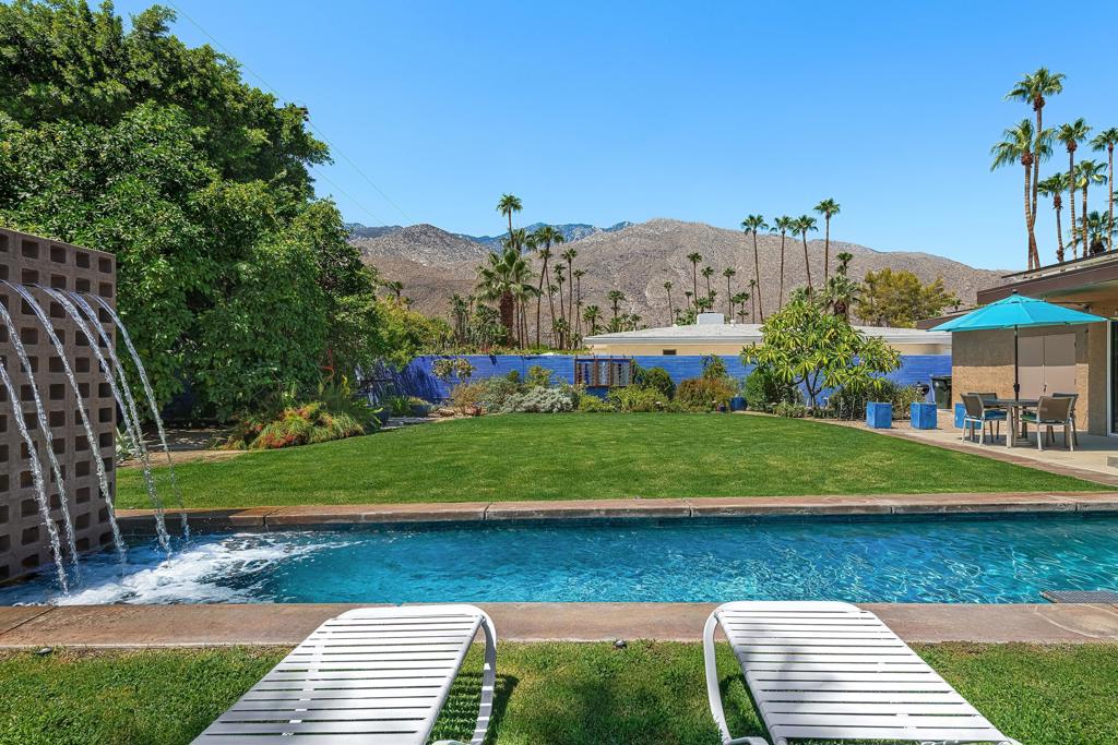 South facing backyard with captivating mountain views! Welcome to a stunning Mid-Century oasis in the heart of Deepwell Estates, positioned on one of the neighborhood's most coveted streets. This beautifully preserved home, lovingly maintained by the same family for over two decades, combines classic elegance with modern sophistication, reminiscent of the famed Trousdale designs. As you enter, you'll be captivated by a striking 40-foot glass wall, perfectly framing the exquisite view of a uniquely designed pool and mountain vistas. The open-concept floor plan seamlessly connects the main living area, dining room, family room and kitchen -- creating an ideal setting for entertaining family and friends. The kitchen was enlarged and reimagined to become a visually sophisticated and highly functional space with plenty of cabinets, center island, gas cooktop, double ovens and built-in bar area. The spacious primary suite offers sliding glass doors that open directly to the pool and frame the breathtaking mountain views. The primary bathroom is a luxurious retreat featuring a double vanity, zero-entry shower, and an exterior door for convenient access to the outdoor shower and pool. Two additional well-sized bedrooms include one en-suite, perfect for guests and family. The expansive backyard has room to roam with several seating and entertaining areas all complimented by a row of citrus trees, firepit and dramatic mountain views. Recent enhancements, include a resurfaced roof in 2024, variable-speed pool pump in 2022, owned solar panels with inverter in 2021, updated electrical, plumbing, dual pane windows, Fleetwood sliders and heat pumps highlighting the home's enhanced functionality ensuring cost-effective living. This exceptional residence, located within one of Palm Springs' most beloved neighborhoods, perfectly captures the essence of desert living. This home radiates the Palm Springs lifestyle you've been waiting for!