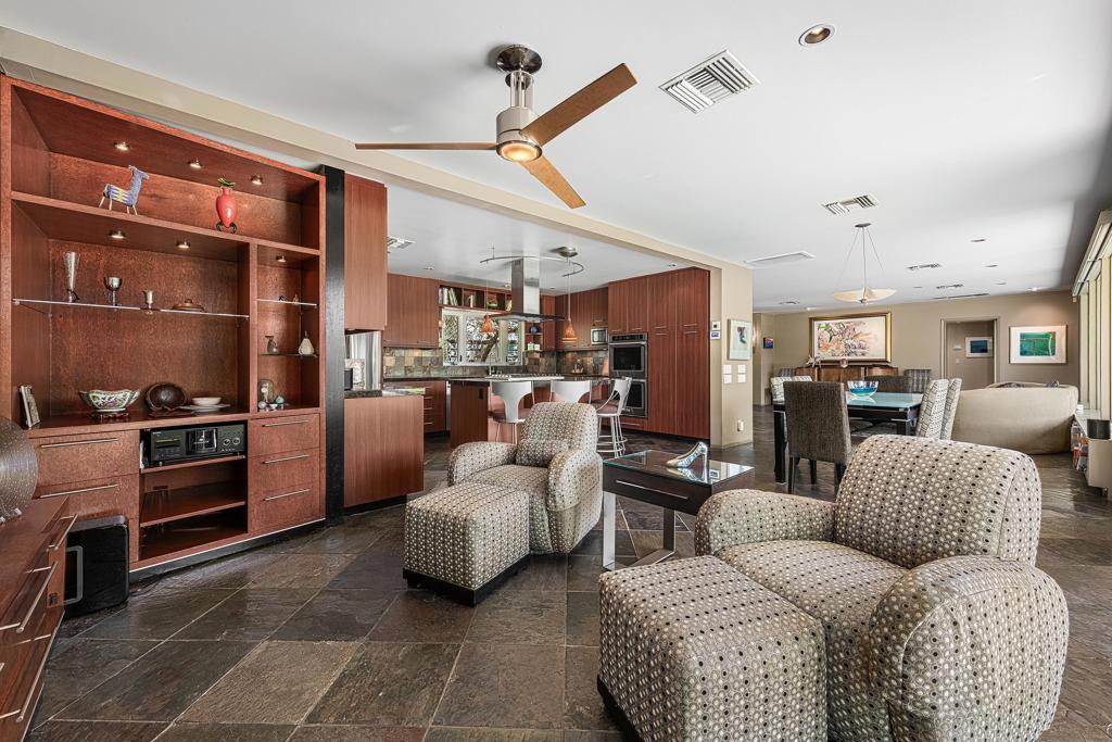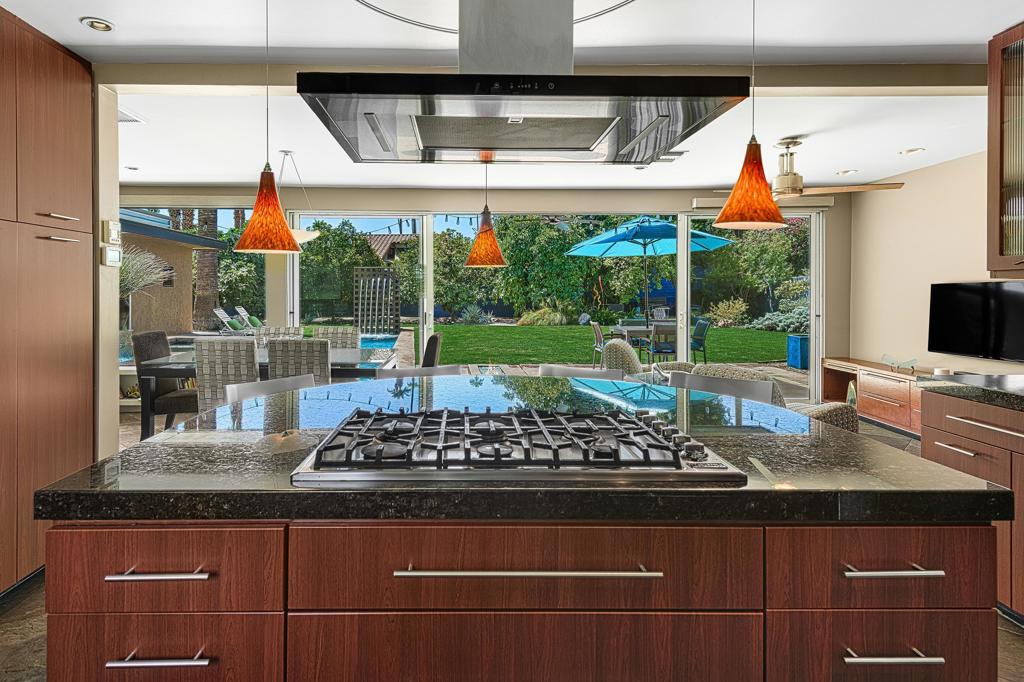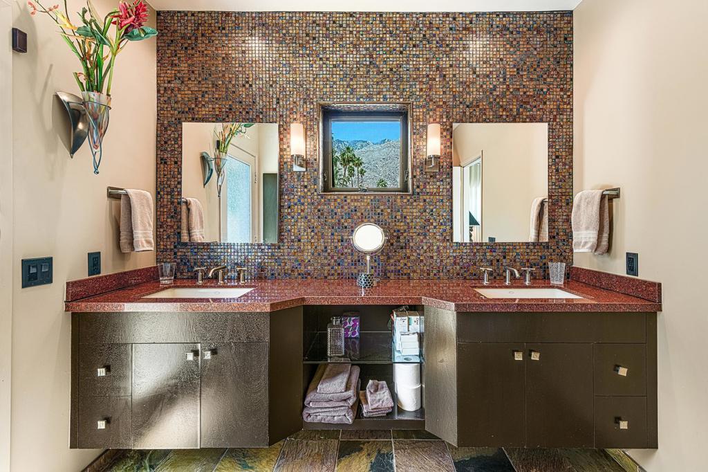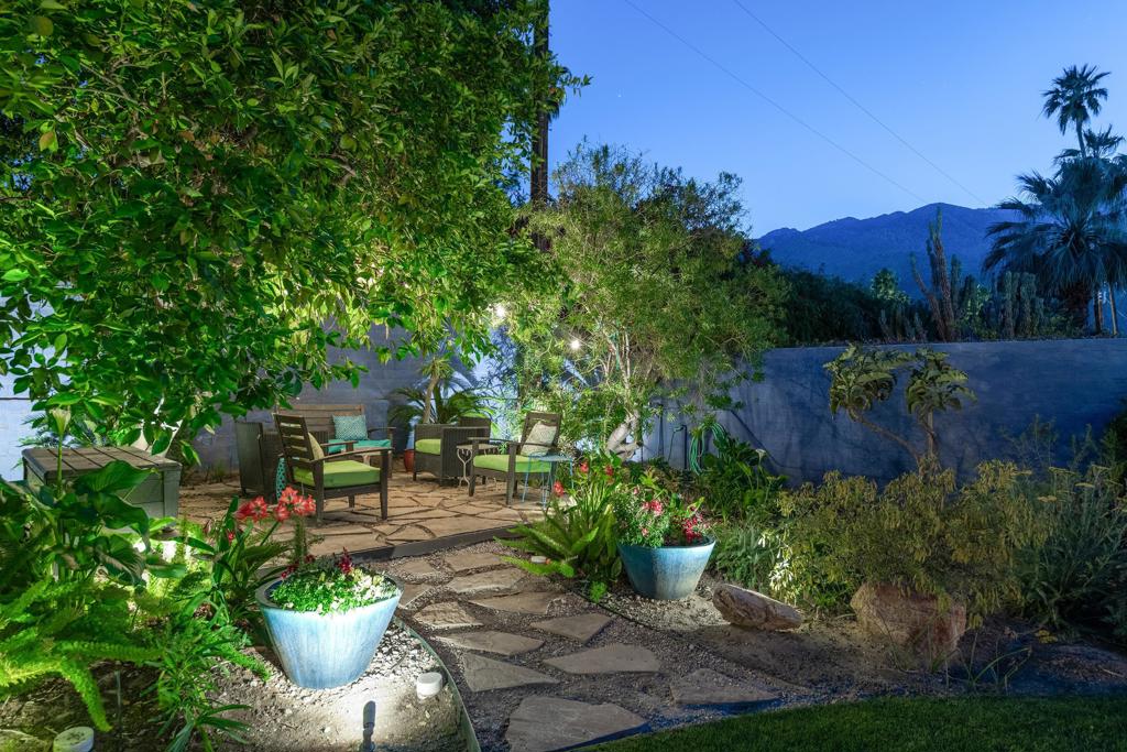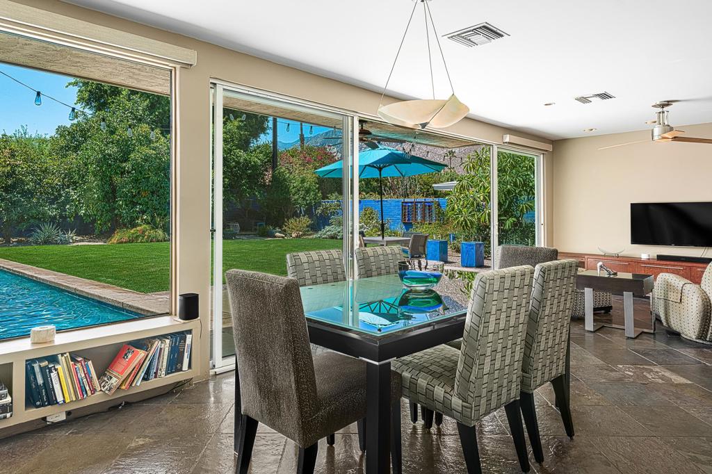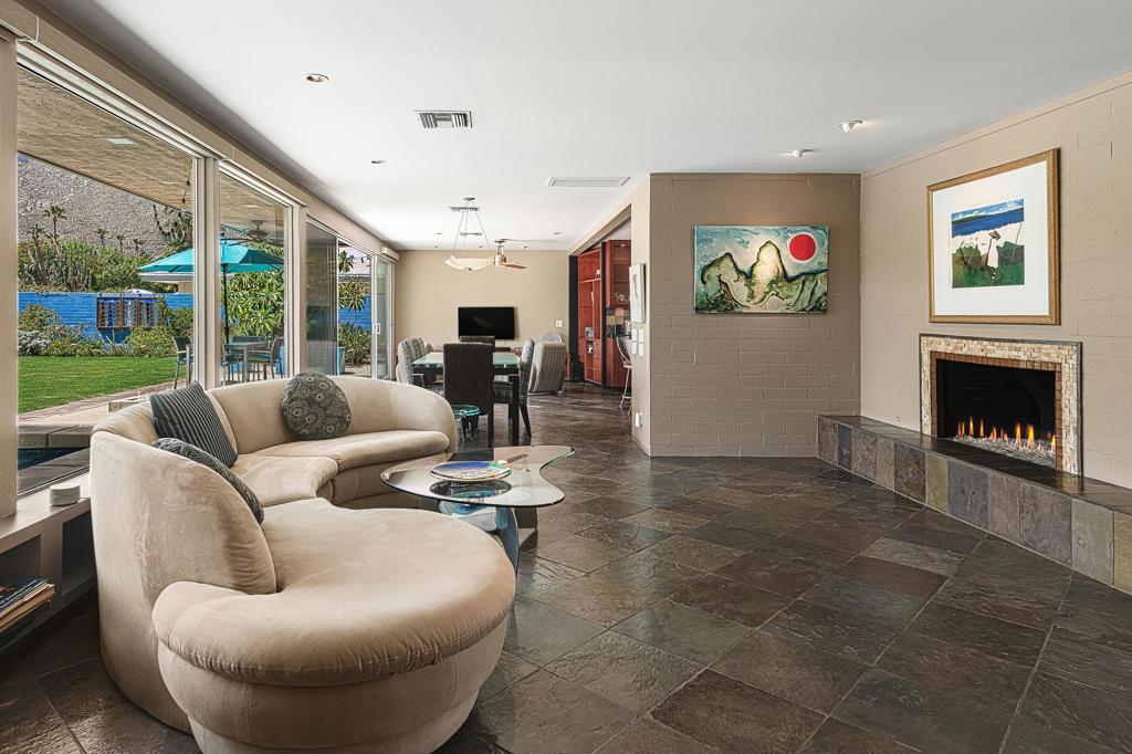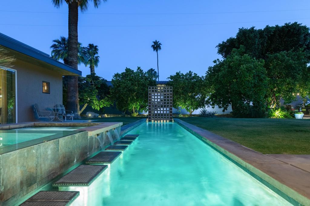 South facing backyard with captivating mountain views! Welcome to a stunning Mid-Century oasis in the heart of Deepwell Estates, positioned on one of the neighborhood's most coveted streets. This beautifully preserved home, lovingly maintained by the same family for over two decades, combines classic elegance with modern sophistication, reminiscent of the famed Trousdale designs. As you enter, you'll be captivated by a striking 40-foot glass wall, perfectly framing the exquisite view of a uniquely designed pool and mountain vistas. The open-concept floor plan seamlessly connects the main living area, dining room, family room and kitchen -- creating an ideal setting for entertaining family and friends. The kitchen was enlarged and reimagined to become a visually sophisticated and highly functional space with plenty of cabinets, center island, gas cooktop, double ovens and built-in bar area. The spacious primary suite offers sliding glass doors that open directly to the pool and frame the breathtaking mountain views. The primary bathroom is a luxurious retreat featuring a double vanity, zero-entry shower, and an exterior door for convenient access to the outdoor shower and pool. Two additional well-sized bedrooms include one en-suite, perfect for guests and family. The expansive backyard has room to roam with several seating and entertaining areas all complimented by a row of citrus trees, firepit and dramatic mountain views. Recent enhancements, include a resurfaced roof in 2024, variable-speed pool pump in 2022, owned solar panels with inverter in 2021, updated electrical, plumbing, dual pane windows, Fleetwood sliders and heat pumps highlighting the home's enhanced functionality ensuring cost-effective living. This exceptional residence, located within one of Palm Springs' most beloved neighborhoods, perfectly captures the essence of desert living. This home radiates the Palm Springs lifestyle you've been waiting for!
