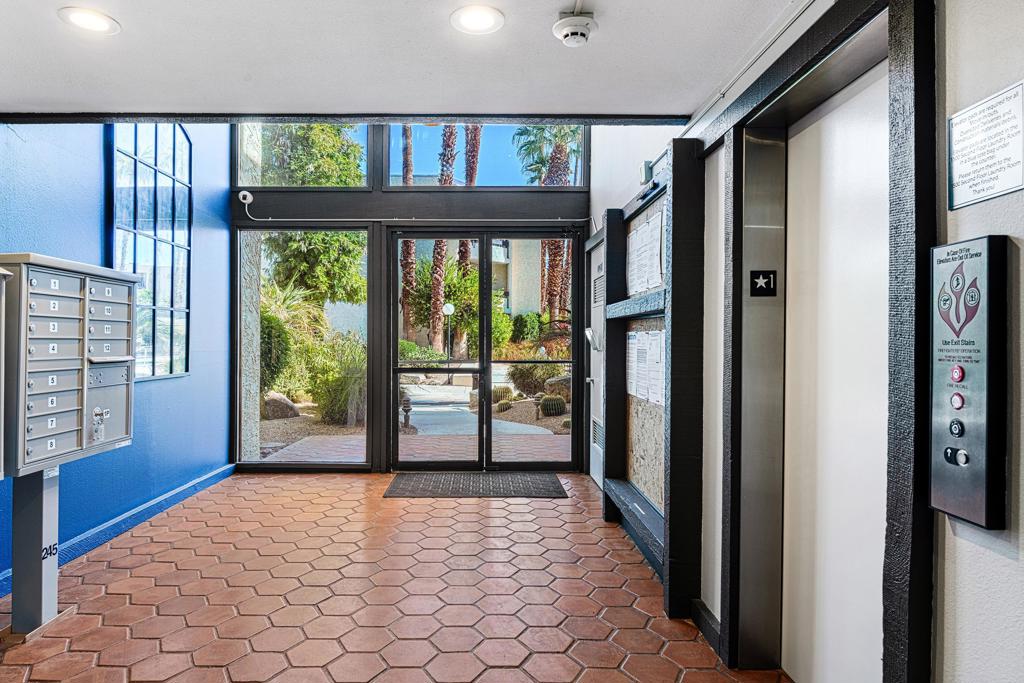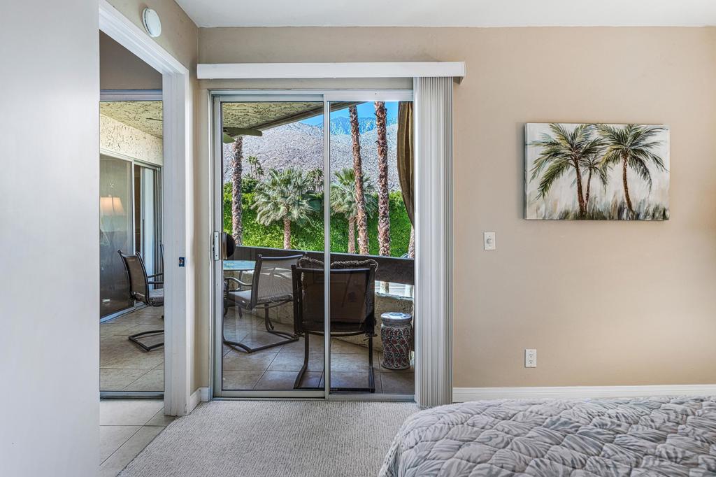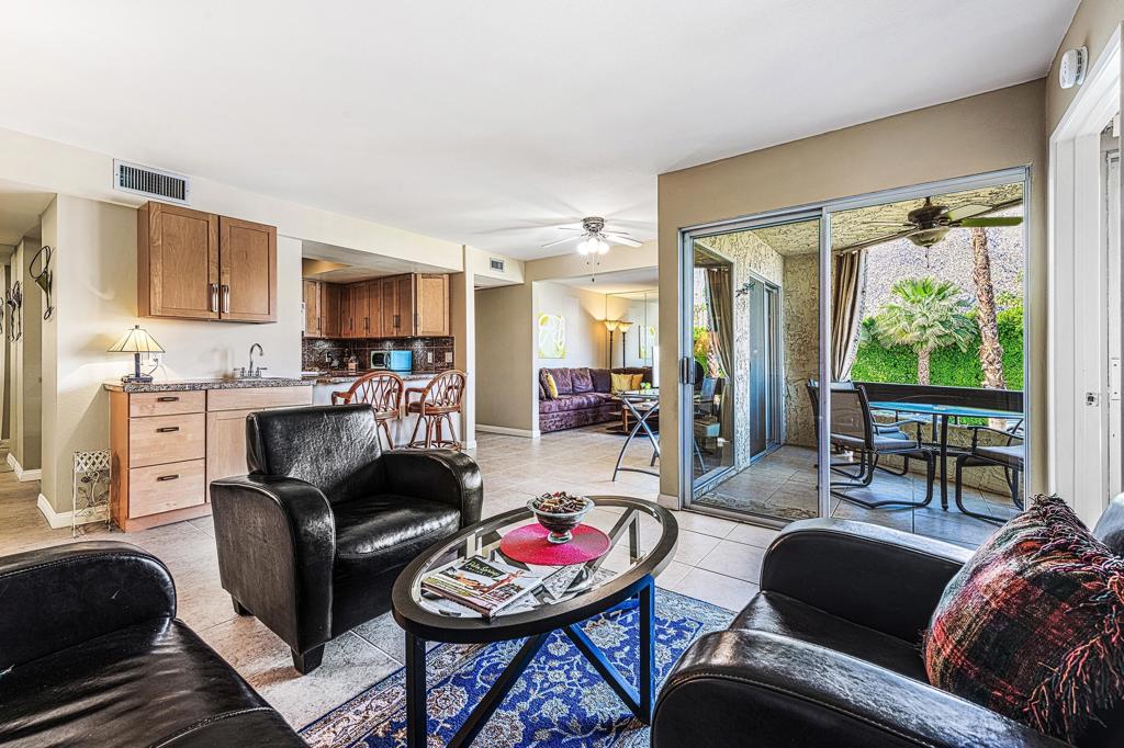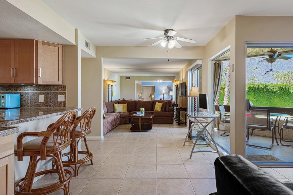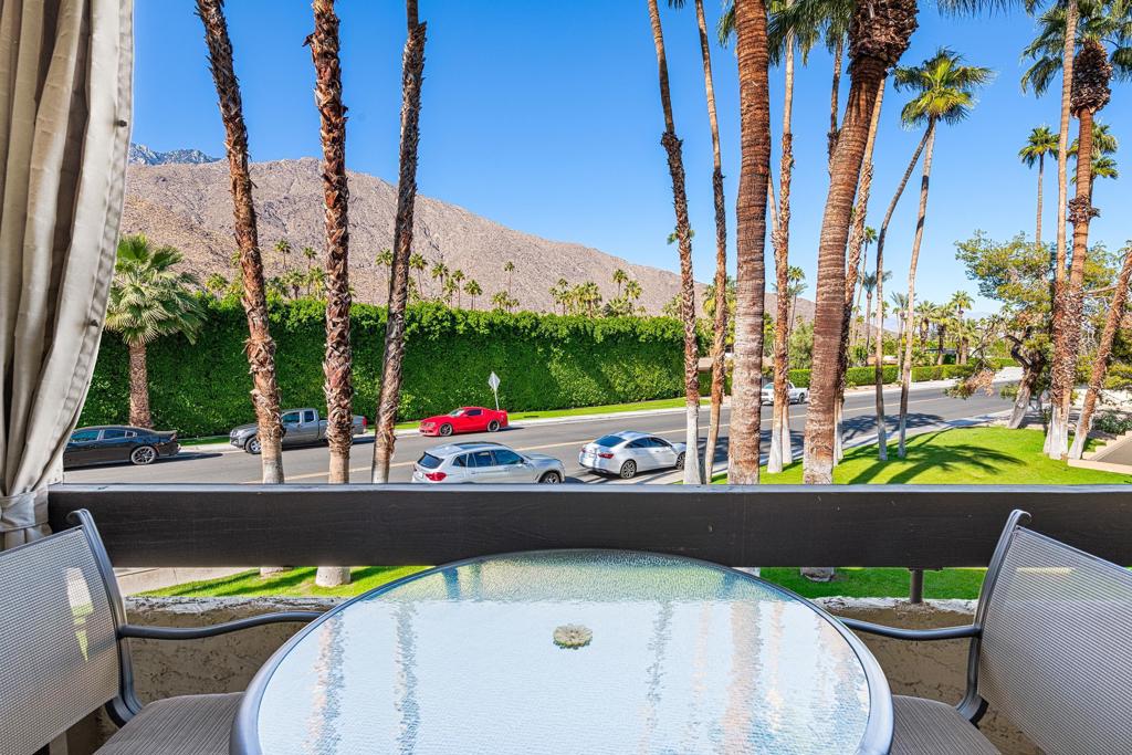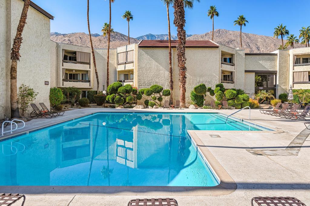 Discover the exceptional corner condo at Biltmore Phase III, featuring the largest floor plan in the highly sought-after South Palm Springs area. This updated, single-level condo on the second floor offers easy elevator access and comes fully furnished, ready for immediate enjoyment. Inside, you'll find tile flooring throughout the main living spaces, with new carpeting and ceiling fans in the bedrooms for added comfort. The open kitchen has ample cabinet space, gas stove and bar seating that seamlessly connects to the living area, which includes a wet bar for entertaining. The condo boasts two spacious bedrooms, each with direct access to en-suite bathrooms, positioned on opposite sides for maximum privacy. Enjoy stunning western mountain views from the large balcony, accessible through three sets of glass sliders. Community amenities include carport parking, a laundry room, an oversized pool, spa, BBQ area, and a cabana with misters for outdoor dining. Conveniently located near downtown and popular destinations like Del Rey at the Villa Royale, Koffi, Ace Hotel and El Mirasol Cantina this property is ideal for full-time living, a second home, or as an investment. With a private land lease extending to 2072 and a new AC unit installed in 2018, this condo ensures comfort and efficiency. Experience the best of Palm Springs living with this remarkable offering!