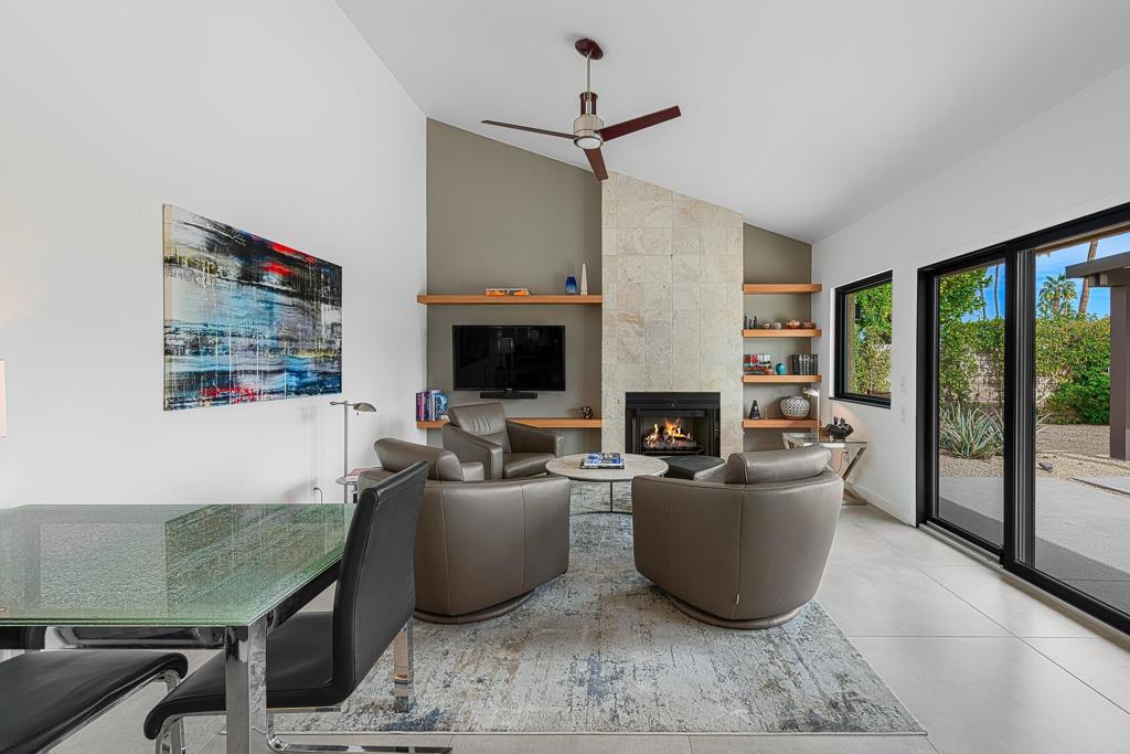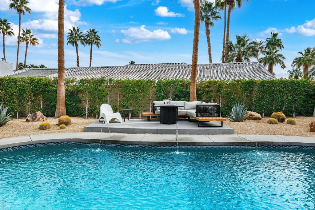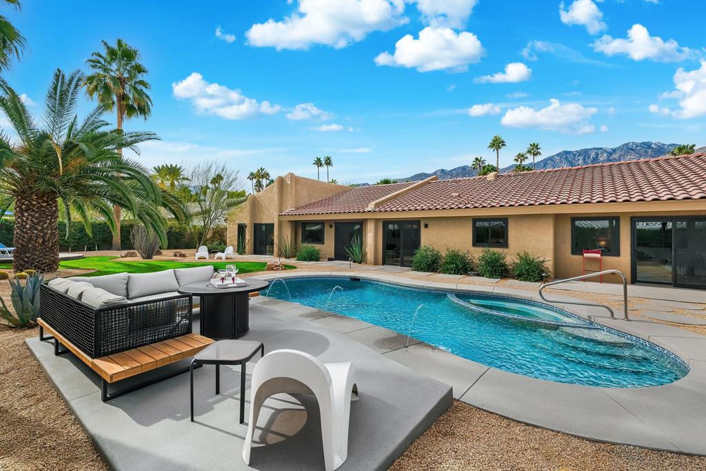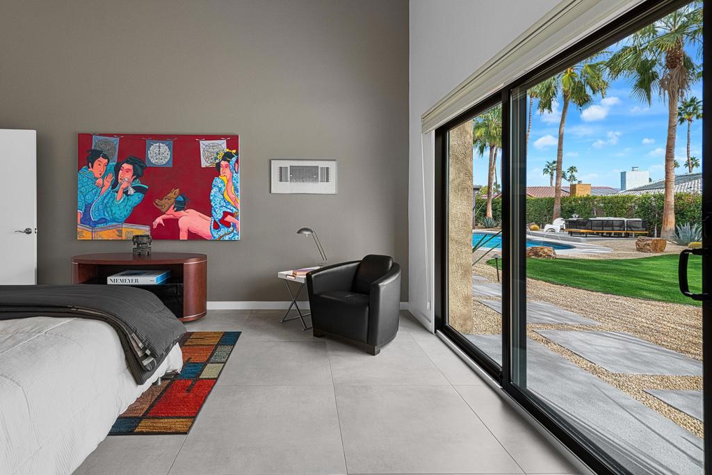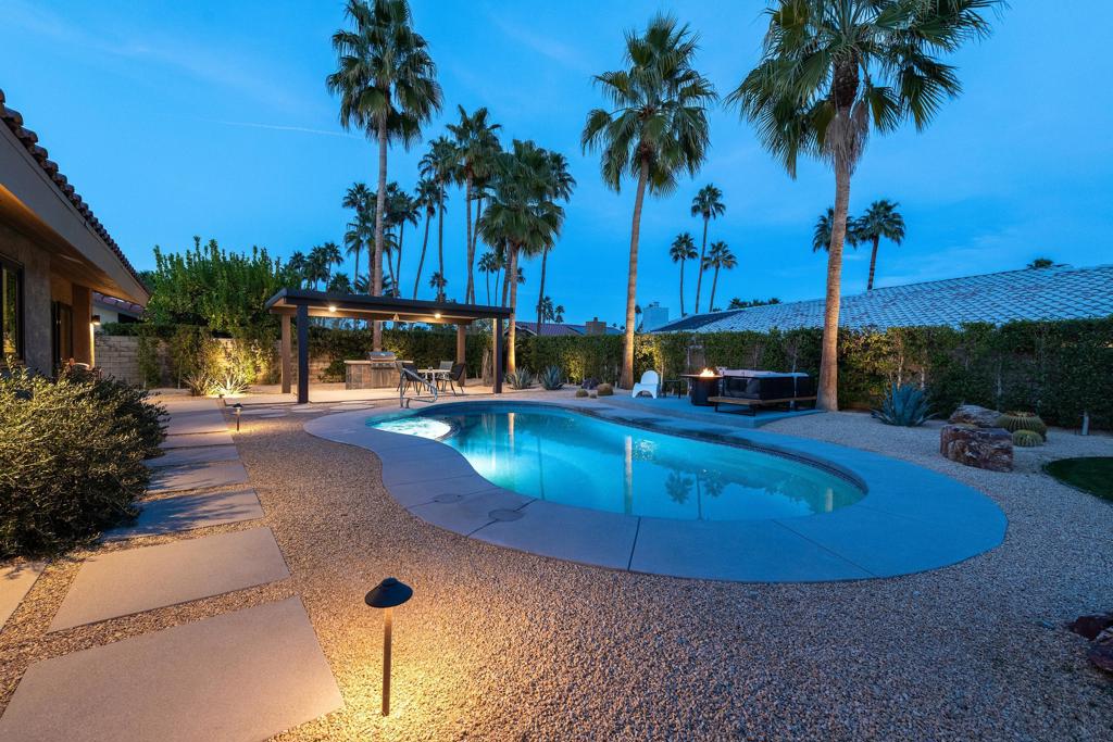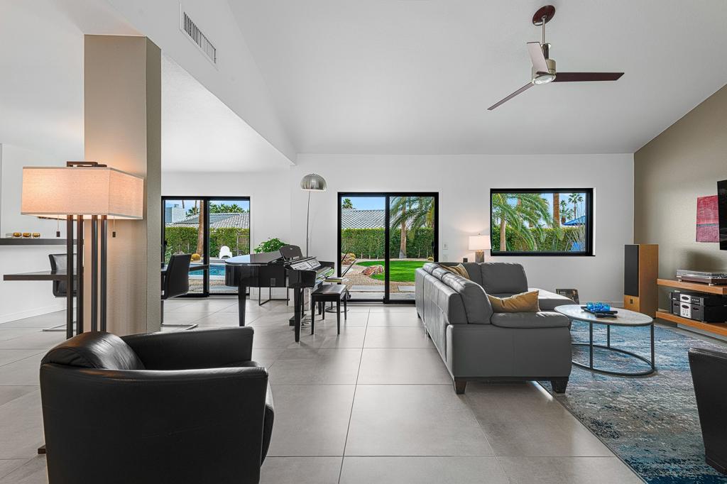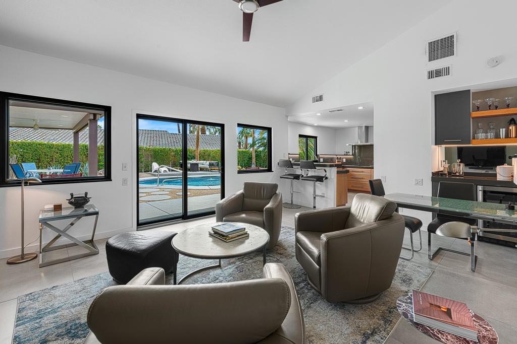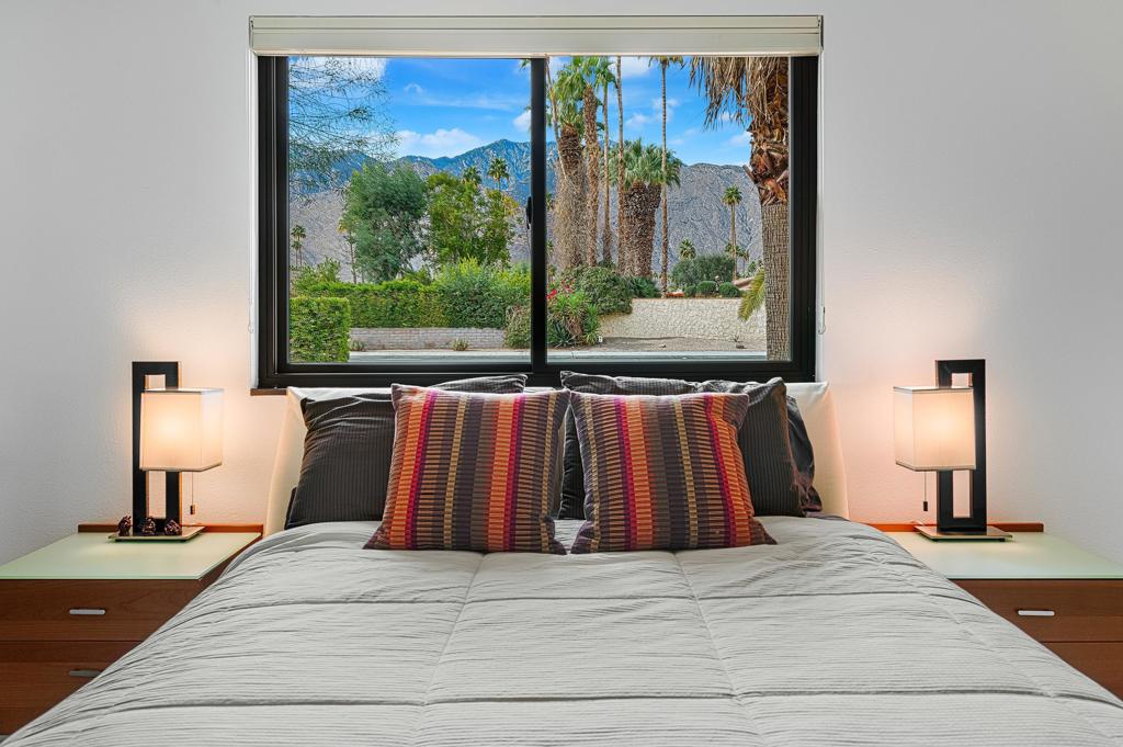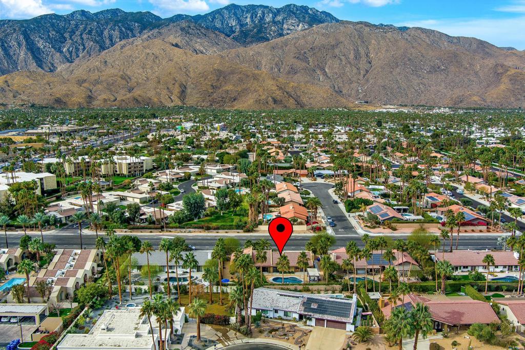 This home was artfully reimagined by the current owner with sustainability in mind! The home was improved with high efficiency low E- windows sliders and doors, energy saving HVAC systems, tankless hot water heater, whole house and garage evaporative cooler, attic ventilation and low flow water faucets and toilets. Sitting on an oversized lot with mountain views in every direction this home embodies a sleek contemporary feel for today's modern living. Step inside to a sun field interior with a perfectly designed floor plan with high vaulted ceilings and large porcelain tile throughout. The main living space consists of two separate living areas on opposite sides of the home with kitchen and dining in between. This layout offers both functionality and flow, providing an ideal setting for both relaxation and entertainment. The kitchen is centrally located with views of the living spaces. The kitchen has been thoughtfully planned out with stainless appliances, double oven, gas cooktop, complemented by abundant cabinet and counter space. The two primary suites offer flexibility both with luxurious bathrooms and adjustable closet systems allowing you to design the closets to fit all types of clothing and storage! A third bedroom is available to serve as an additional sleeping space or a perfect home office. Step outside to your private park-like-oasis complete with a fully updated pool and spa with low maintenance and new pool equipment, an outdoor kitchen, a covered dining area, and multiple lounging spaces, including one with a fire-pit for those cool desert nights. Additional highlights are a three-car garage for those car enthusiasts with a beautiful epoxy floor and tons of storage all on land you own in South Palm Springs. Walkable to shopping, restaurants, and all your everyday needs, this home offers a perfect blend of luxury living and accessibility to essential amenities.
