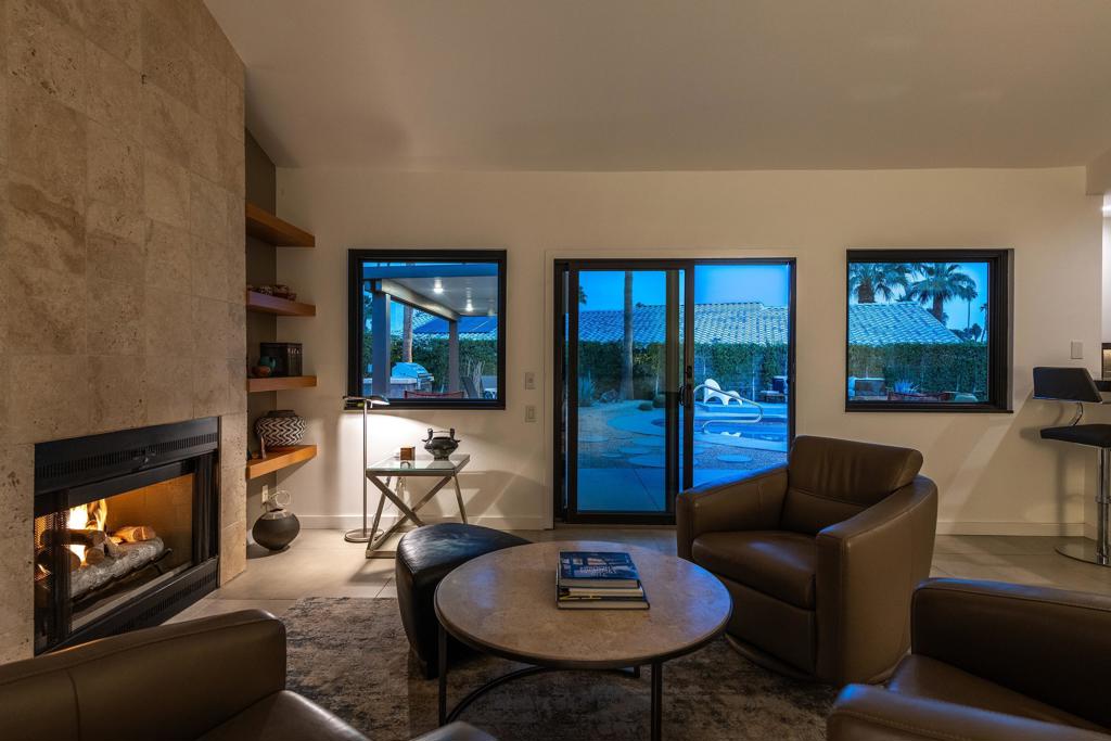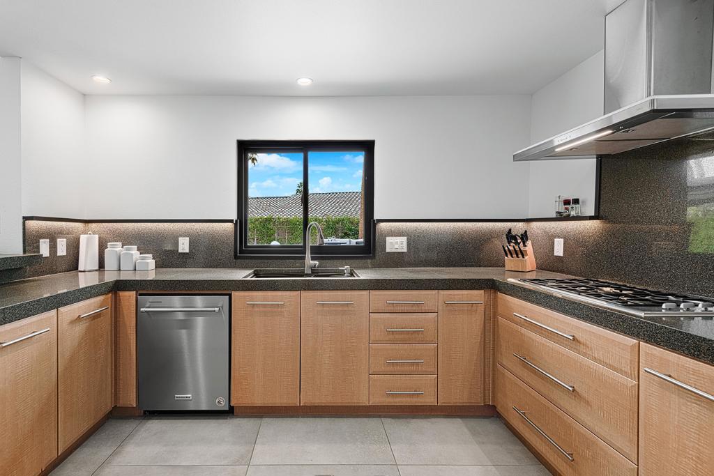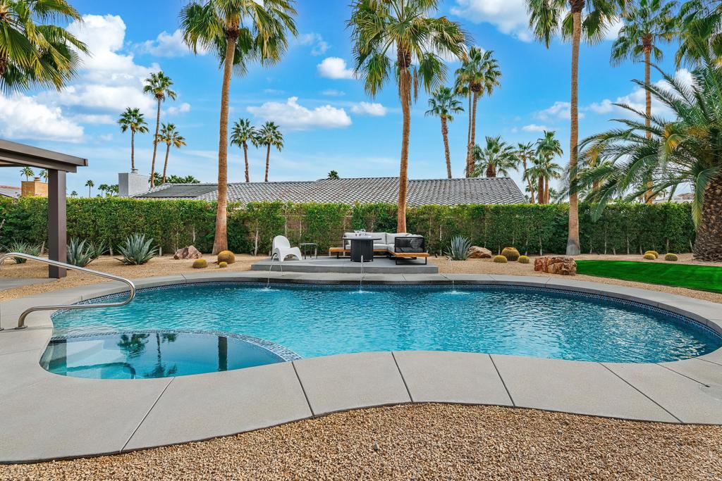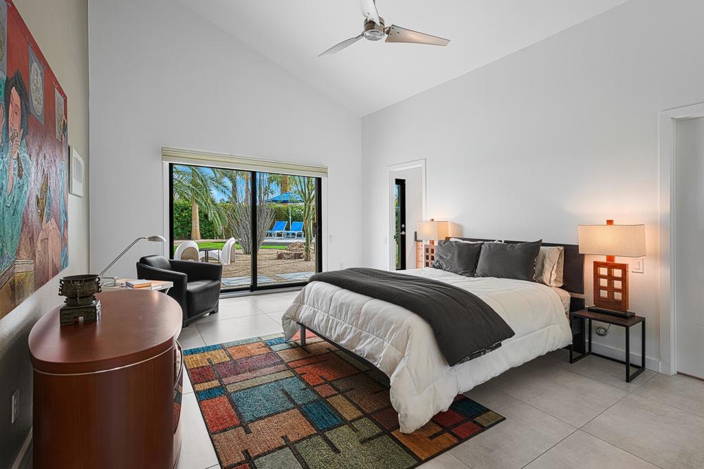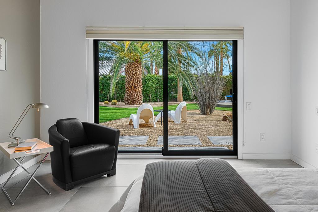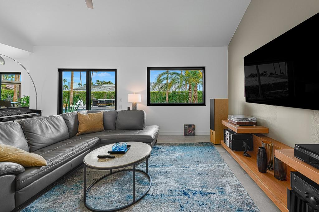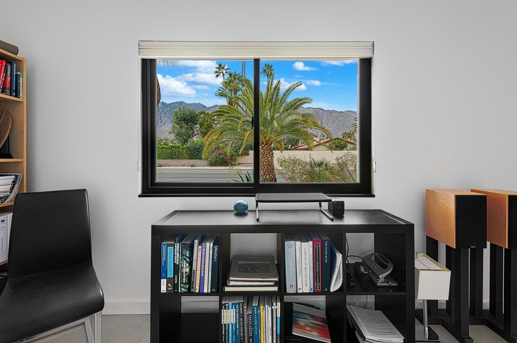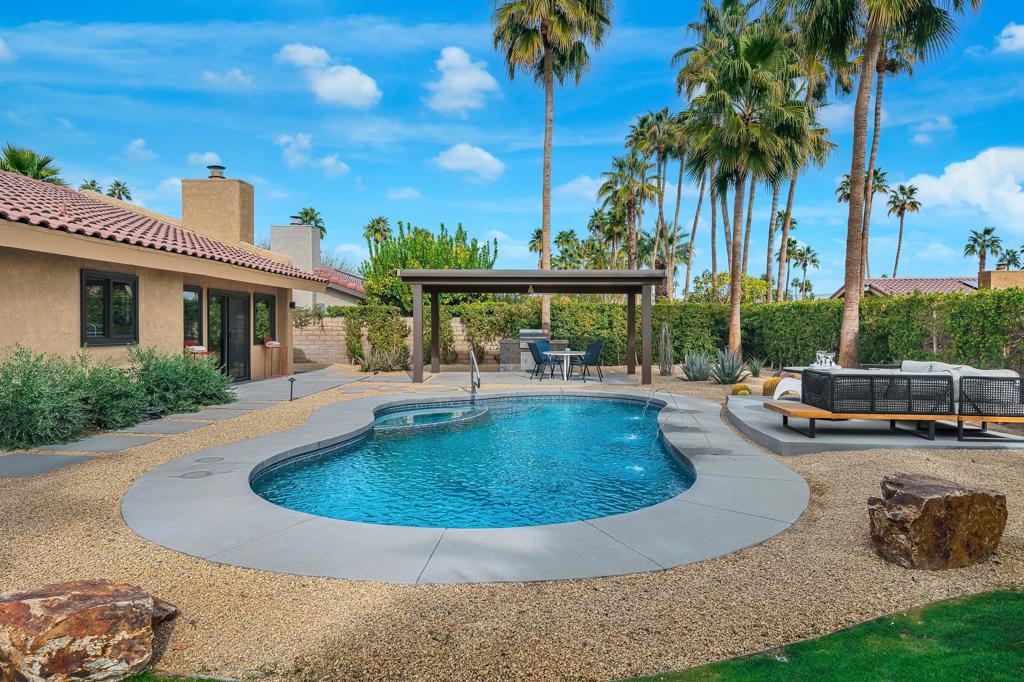 This home was artfully reimagined by the current owner with sustainability in mind! The home was improved with high efficiency low E- windows sliders and doors, energy saving HVAC systems, tankless hot water heater, whole house and garage evaporative cooler, attic ventilation and low flow water faucets and toilets. Sitting on an oversized lot with mountain views in every direction this home embodies a sleek contemporary feel for today's modern living. Step inside to a sun field interior with a perfectly designed floor plan with high vaulted ceilings and large porcelain tile throughout. The main living space consists of two separate living areas on opposite sides of the home with kitchen and dining in between. This layout offers both functionality and flow, providing an ideal setting for both relaxation and entertainment. The kitchen is centrally located with views of the living spaces. The kitchen has been thoughtfully planned out with stainless appliances, double oven, gas cooktop, complemented by abundant cabinet and counter space. The two primary suites offer flexibility both with luxurious bathrooms and adjustable closet systems allowing you to design the closets to fit all types of clothing and storage! A third bedroom is available to serve as an additional sleeping space or a perfect home office. Step outside to your private park-like-oasis complete with a fully updated pool and spa with low maintenance and new pool equipment, an outdoor kitchen, a covered dining area, and multiple lounging spaces, including one with a fire-pit for those cool desert nights. Additional highlights are a three-car garage for those car enthusiasts with a beautiful epoxy floor and tons of storage all on land you own in South Palm Springs. Walkable to shopping, restaurants, and all your everyday needs, this home offers a perfect blend of luxury living and accessibility to essential amenities.