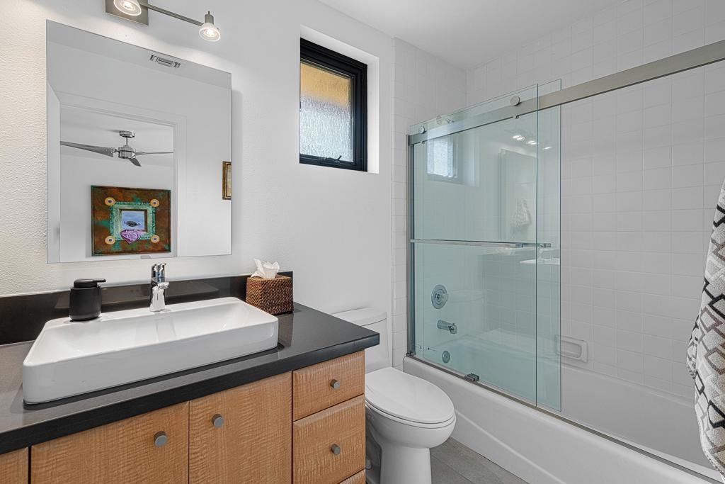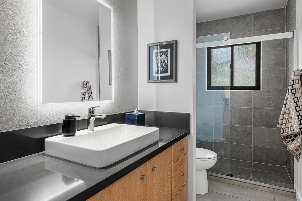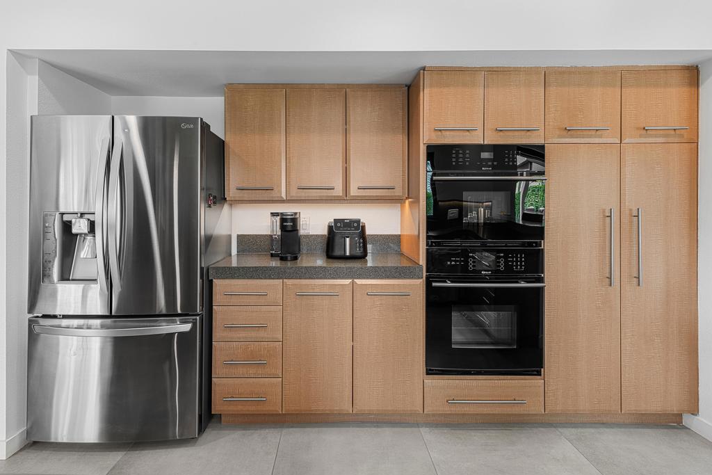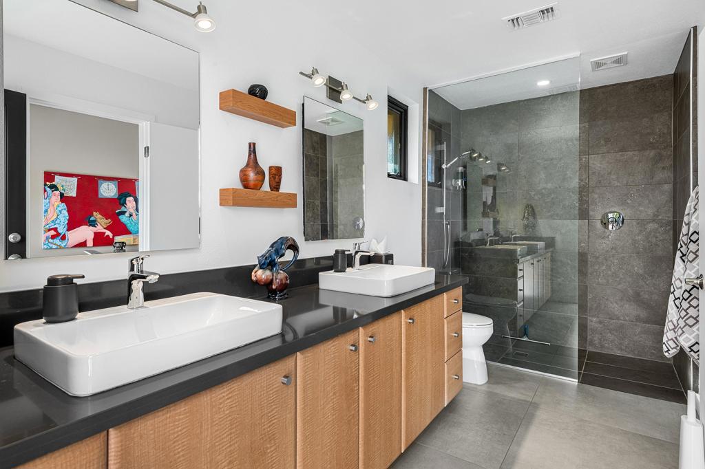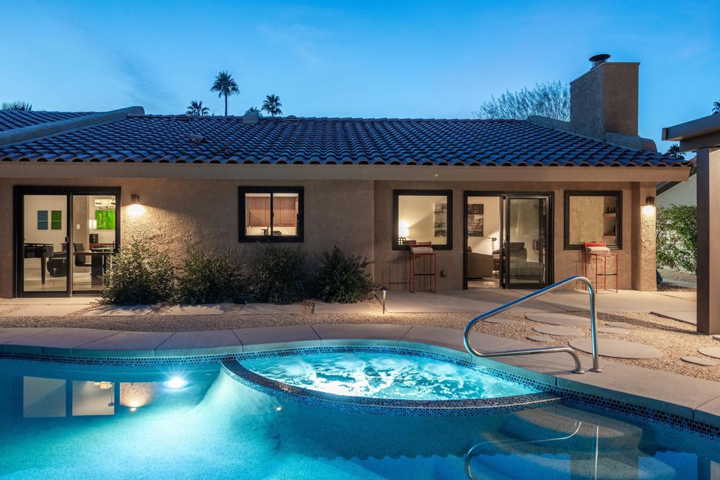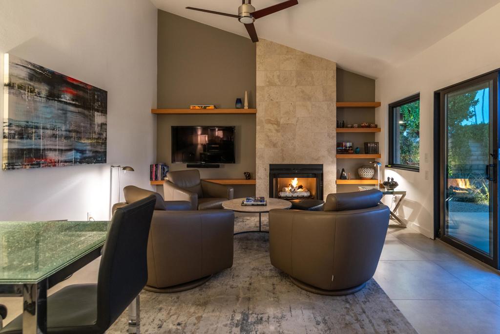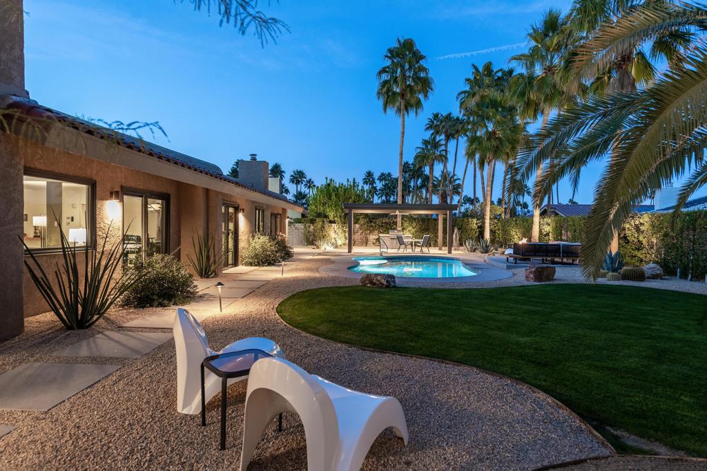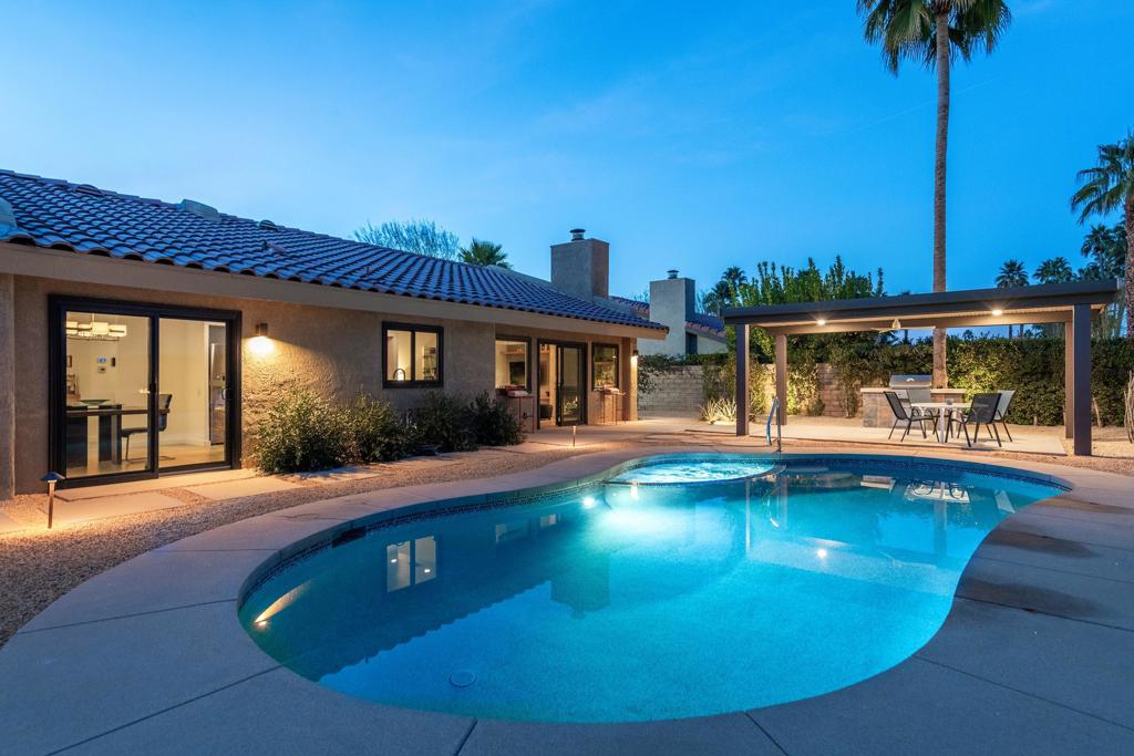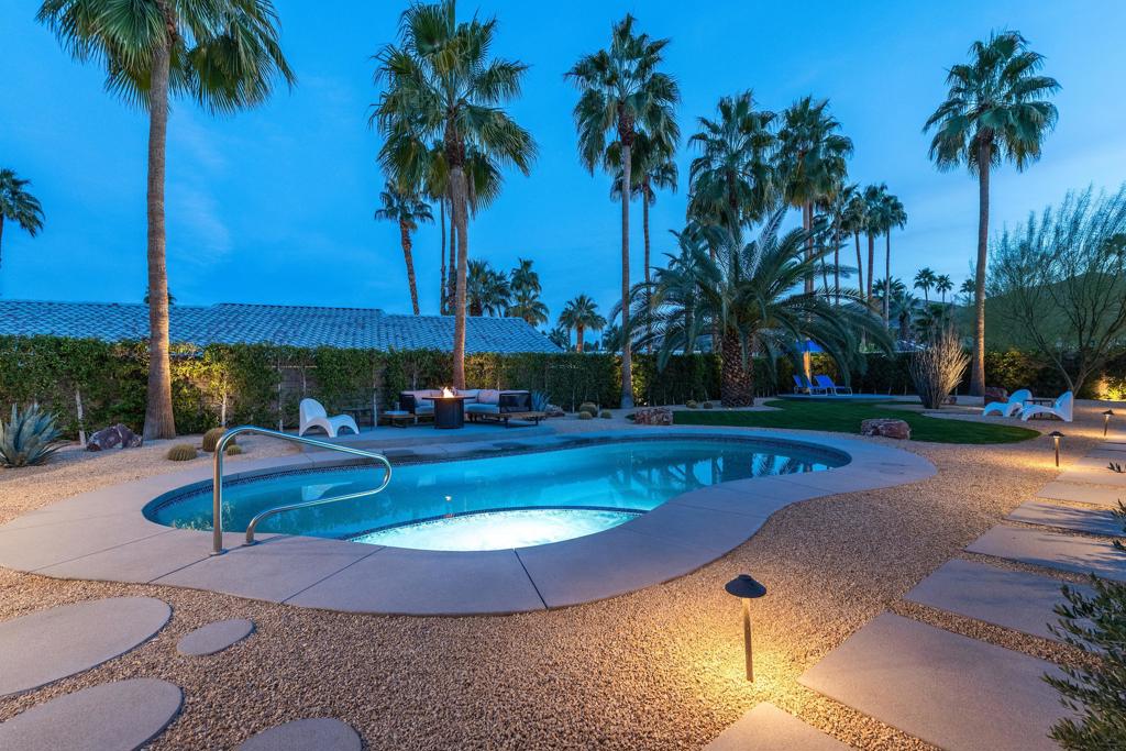 This home was artfully reimagined by the current owner with sustainability in mind! The home was improved with high efficiency low E- windows sliders and doors, energy saving HVAC systems, tankless hot water heater, whole house and garage evaporative cooler, attic ventilation and low flow water faucets and toilets. Sitting on an oversized lot with mountain views in every direction this home embodies a sleek contemporary feel for today's modern living. Step inside to a sun field interior with a perfectly designed floor plan with high vaulted ceilings and large porcelain tile throughout. The main living space consists of two separate living areas on opposite sides of the home with kitchen and dining in between. This layout offers both functionality and flow, providing an ideal setting for both relaxation and entertainment. The kitchen is centrally located with views of the living spaces. The kitchen has been thoughtfully planned out with stainless appliances, double oven, gas cooktop, complemented by abundant cabinet and counter space. The two primary suites offer flexibility both with luxurious bathrooms and adjustable closet systems allowing you to design the closets to fit all types of clothing and storage! A third bedroom is available to serve as an additional sleeping space or a perfect home office. Step outside to your private park-like-oasis complete with a fully updated pool and spa with low maintenance and new pool equipment, an outdoor kitchen, a covered dining area, and multiple lounging spaces, including one with a fire-pit for those cool desert nights. Additional highlights are a three-car garage for those car enthusiasts with a beautiful epoxy floor and tons of storage all on land you own in South Palm Springs. Walkable to shopping, restaurants, and all your everyday needs, this home offers a perfect blend of luxury living and accessibility to essential amenities.