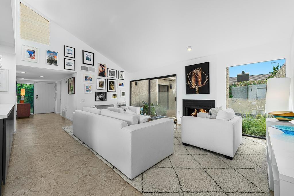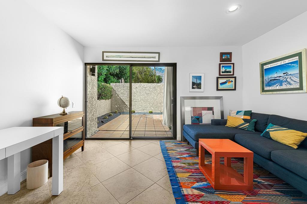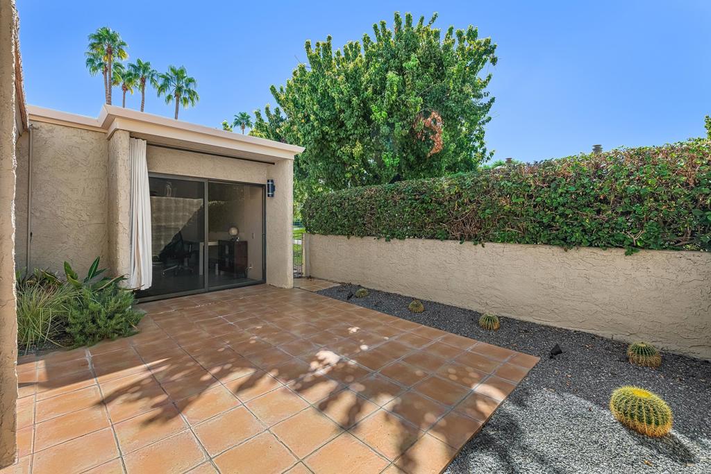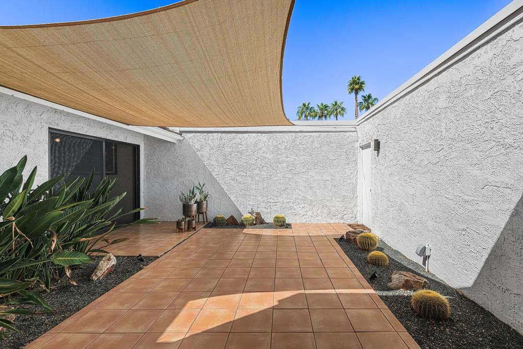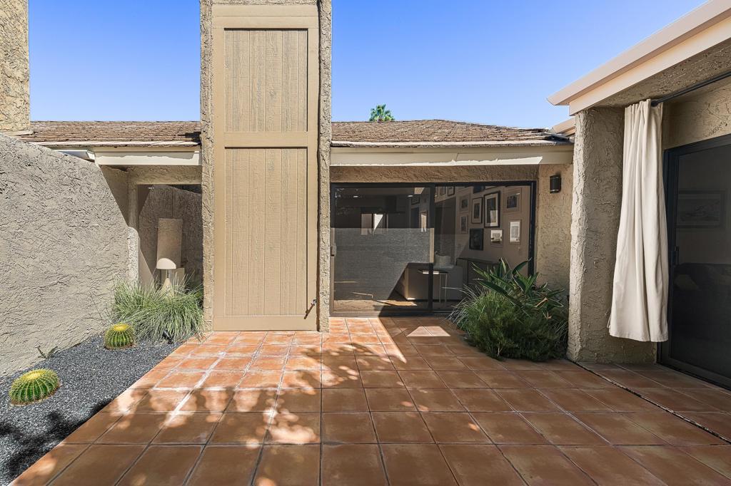 This Hugh Kaptur designed condo is a true 3 bedroom 2 bath with an attached 2 car garage. Designed around a large interior patio this unique concept allows for in-home outside entertaining with complete privacy! Situated in one of the most desirable areas of the complex, this condo exudes a welcoming neighborhood vibe! Inside you will find an open floor plan with high vaulted ceilings and walls of glass allowing the soft flow of light throughout your main living areas. Updated kitchen with a large island, high end appliances and tons of cabinet space. A neutral style tile is continuous throughout the entire home that engenders an expansive flow from room to room. The spacious Primary Suite with room for a cozy sitting area with direct access to your outdoor patio. Primary bathroom has a double vanity and walk-in shower. Two guest bedrooms are on the opposite side of the home that share a central bathroom. There is a 2nd large patio that is perfect for morning coffee or basking in the desert sun. Saddlerock Gardens is a boutique complex of 43 patio homes with 2 pool/spas and 2 tennis courts. Low HOA that covers building, grounds and cable tv. Worryfree style living that is walking distance to restaurants, shopping and coffee houses.