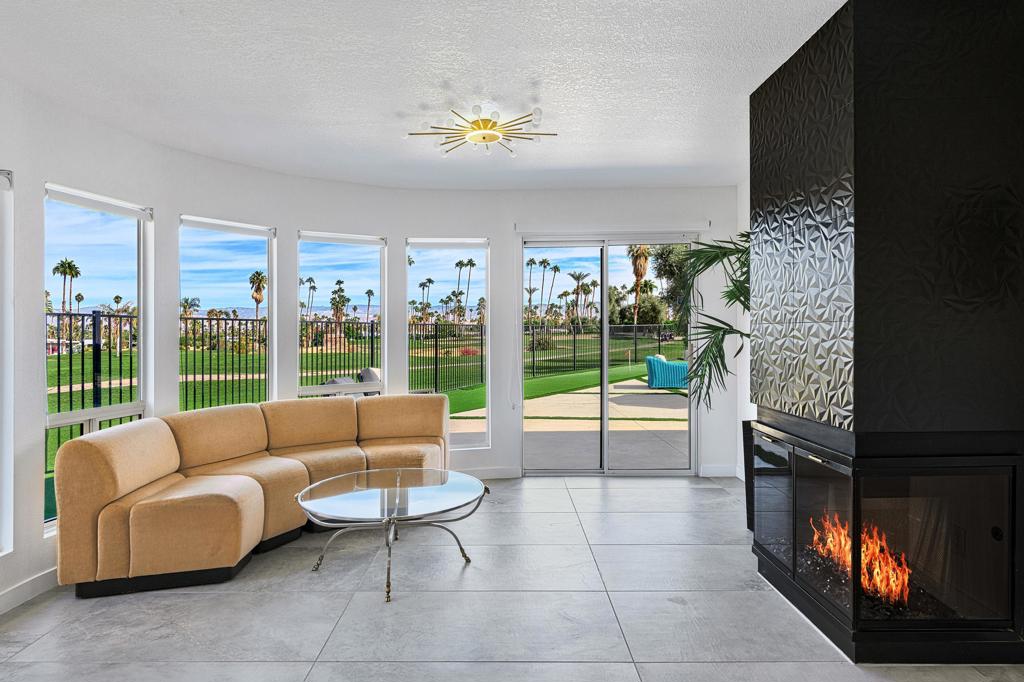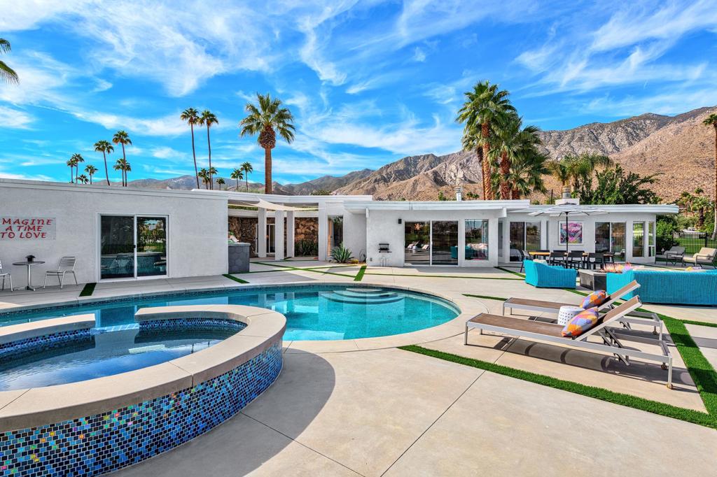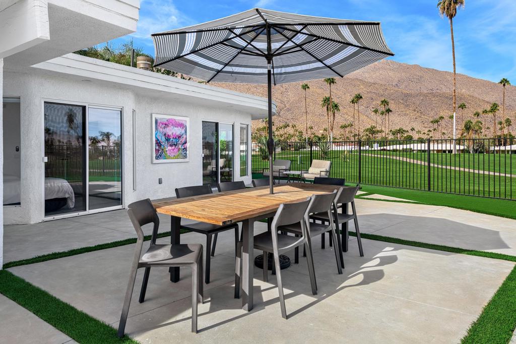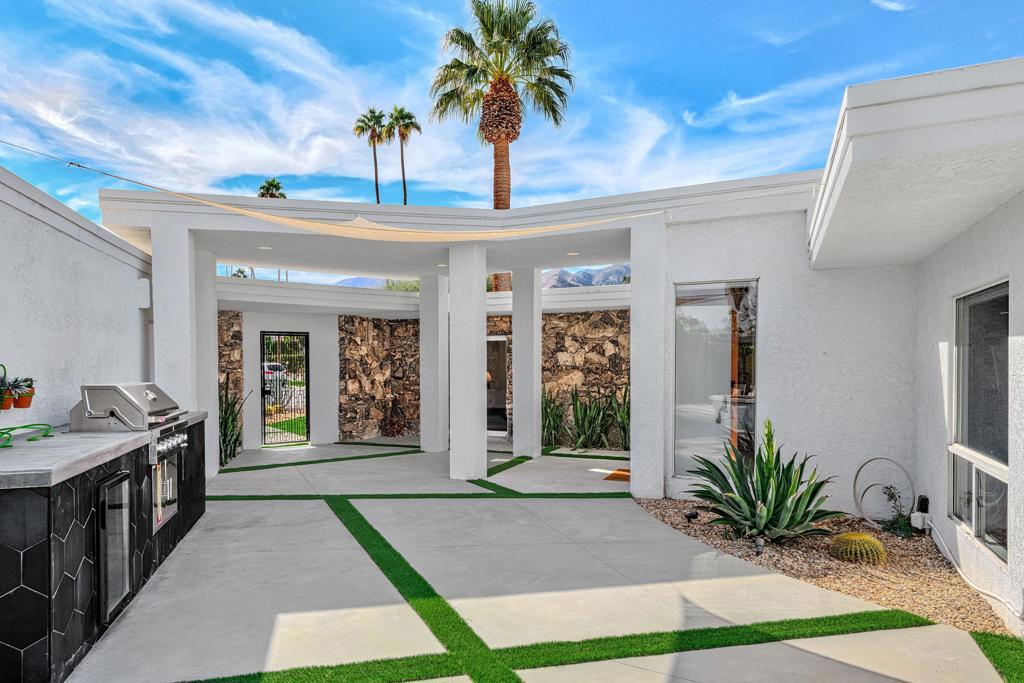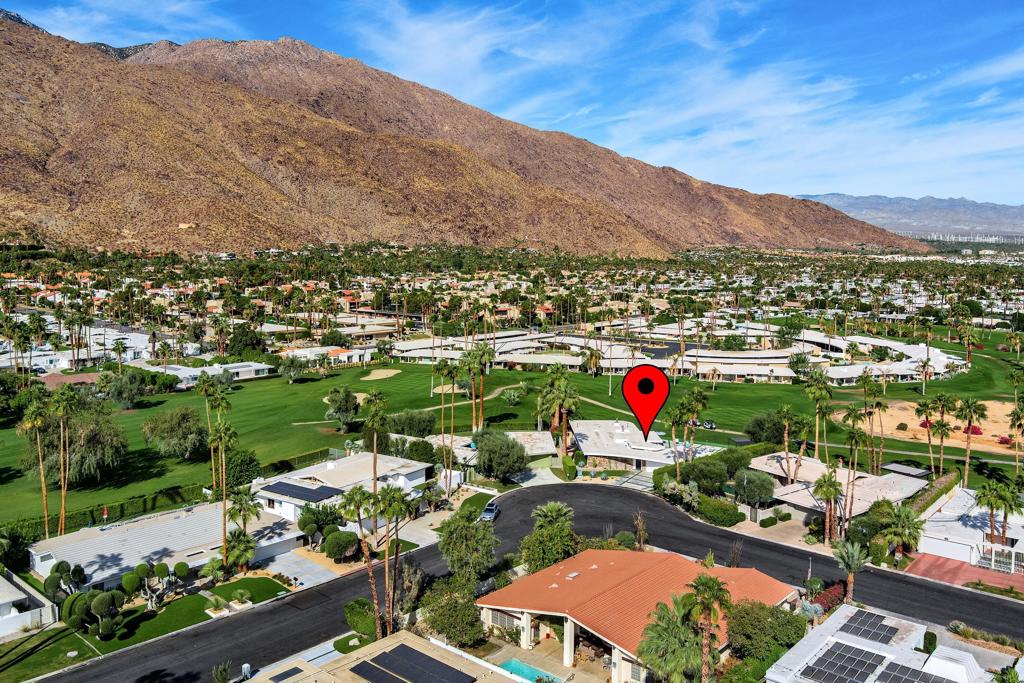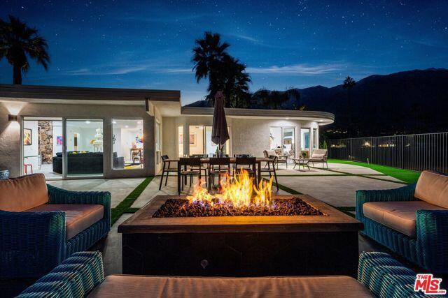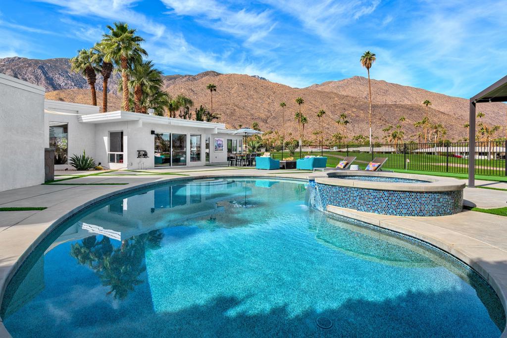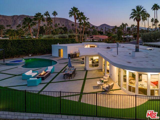 This captivating home sits in a prime golf course location in Indian Canyons subdivision. Designed by the renowned architect Hugh Kaptur (AIA), is a masterful display of Mid-century architecture, artfully integrating classic design with modern comforts. The outdoor space offers stunning mountain vistas and features a top-of-the-line BBQ area, making it perfect for hosting large gatherings or enjoying intimate family time. Relaxation is guaranteed with a large pool and spa, and a newly built pergola provides a cool, shaded escape. Inside, the spacious open living area boasts a stylish fireplace, seamless porcelain tile flooring, and expansive glass walls. The kitchen is a chef's dream, equipped with high-end stainless-steel appliances, generous cabinet space, and a large island with bar seating. The home offers five beautifully appointed bedrooms, ensuring plenty of space and privacy. The luxurious primary suite is a private retreat, complete with a lounge area, fireplace, and breathtaking views of the golf course, pool, and the majestic San Jacinto mountains. Four bedrooms are located in the main house, with a detached casita providing flexibility as an additional bedroom or poolside lounge. Ideally located in South Palm Springs, this residence is an invitation to live in leisure and style.