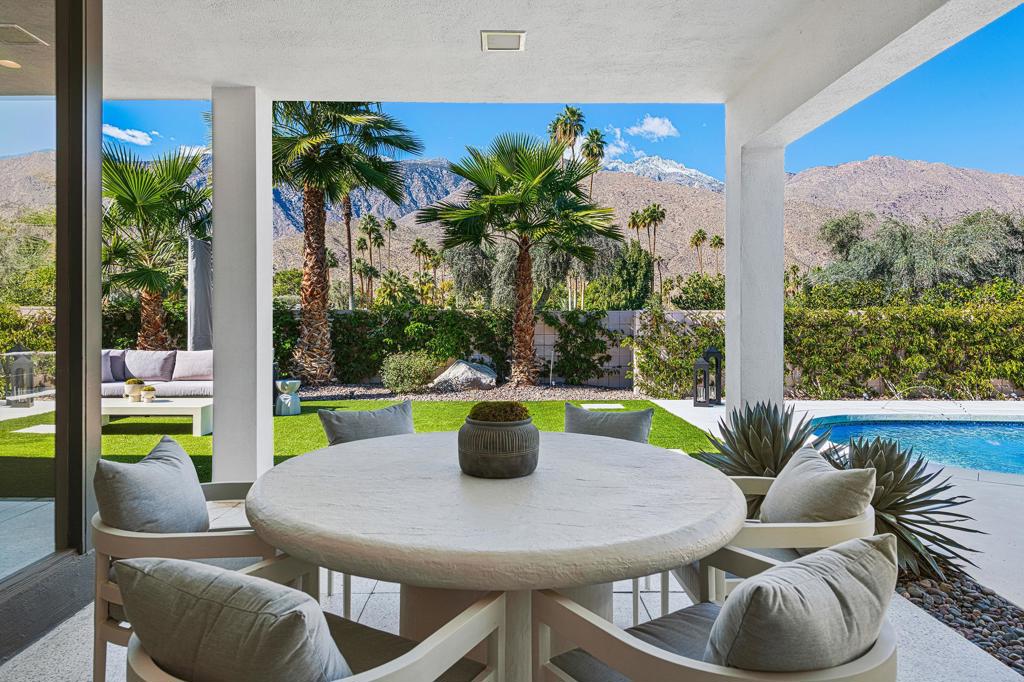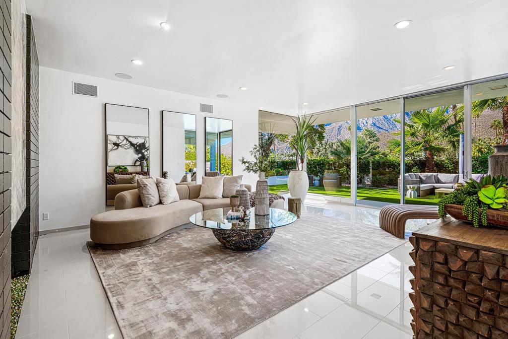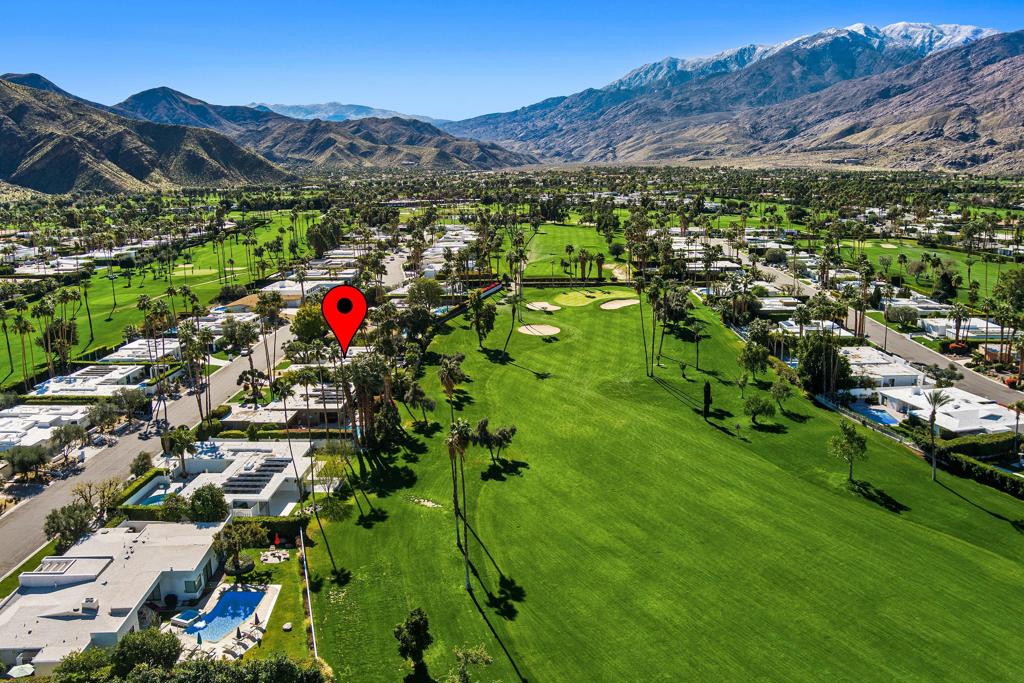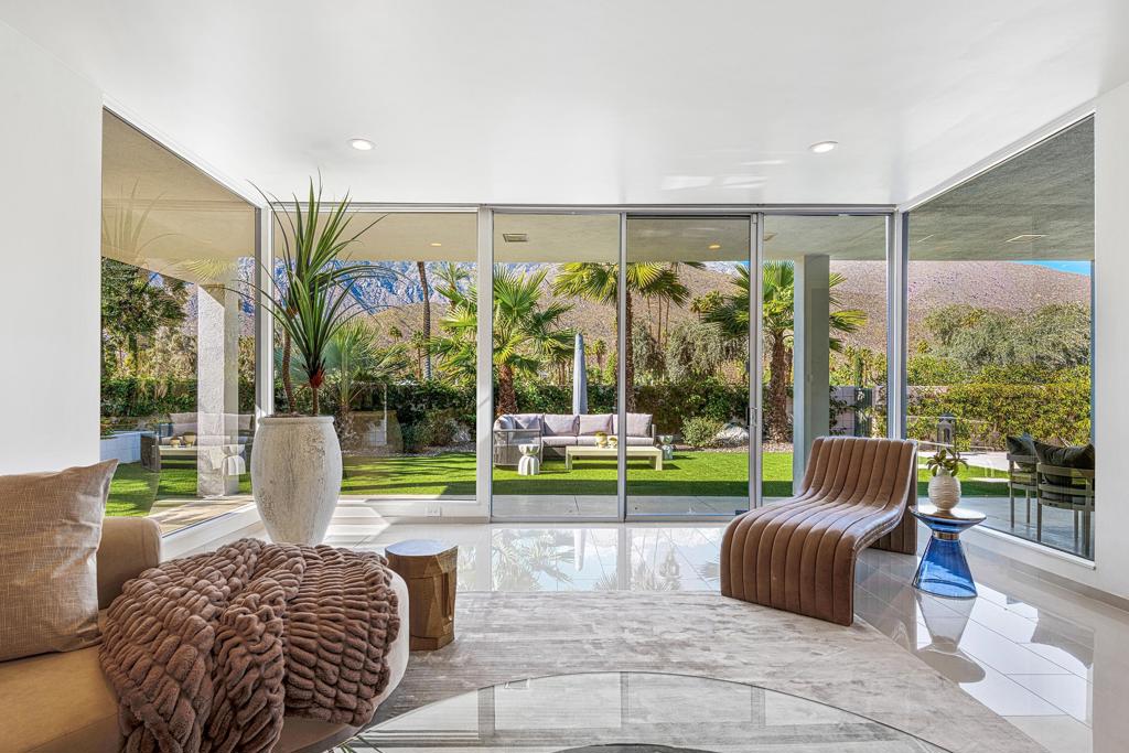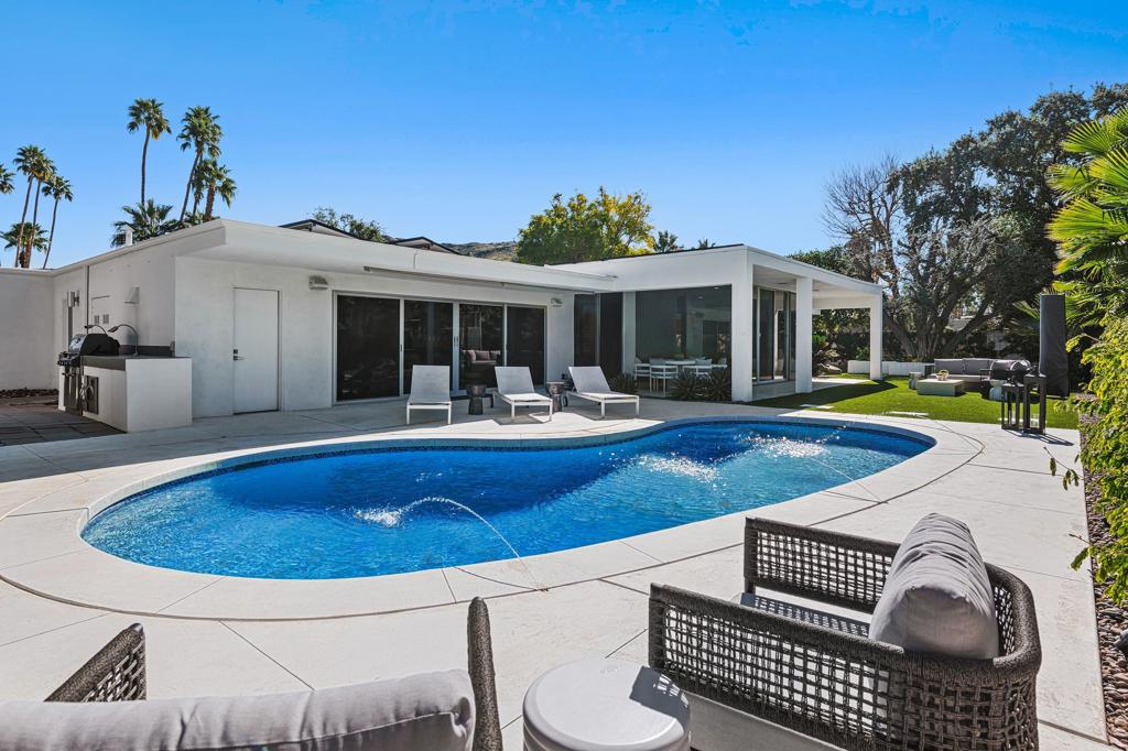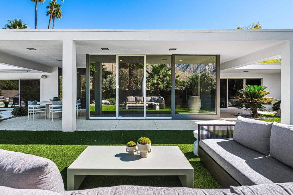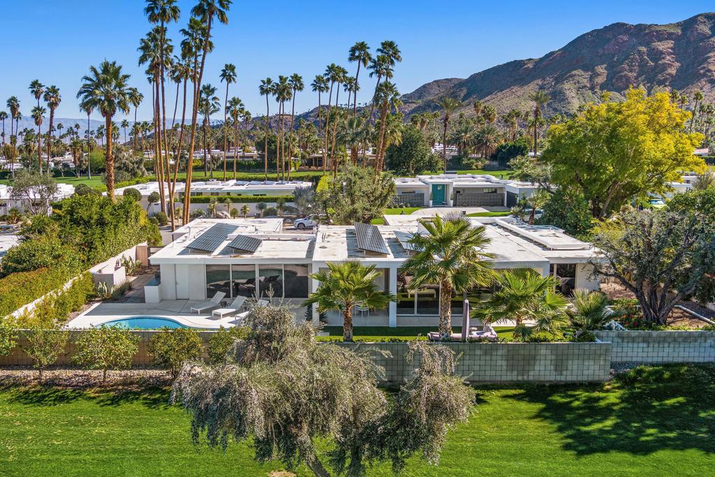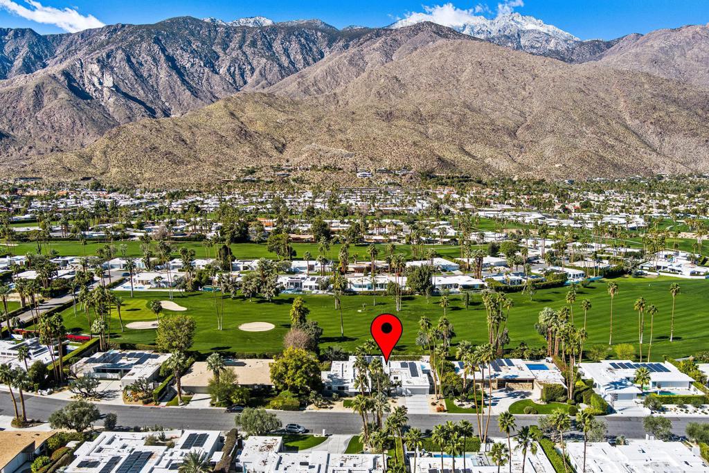 Nestled along the 17th fairway of the Indian Canyons Golf Course, this stunning mid-century modern home has undergone a meticulous transformation, blending timeless architecture with contemporary design and efficiency. Boasting west-facing views of the majestic San Jacinto Mountains, this approximately 2900-square-foot residence offers a seamless indoor-outdoor living experience. Upon entry, the floor-to-ceiling living room glass and terrazzo patios effortlessly capture the essence of its original design era. The all-new kitchen features quartz and marble countertops, sleek Italian design cabinetry, and top-of-the-line Miele and Wolf appliances, creating a culinary haven. The open concept kitchen/family room, adorned with expansive glass sliders, seamlessly connects to the backyard and pool, offering a perfect setting for relaxing and entertaining. The generously sized primary suite is accompanied by an oversized bath, complete with a freestanding tub and a luxurious oversized shower. An all-new outdoor shower adds a touch of indulgence to the outdoor experience. The outdoor space has been thoughtfully redesigned to include an outdoor barbecue and a drought-tolerant lawn, blending functionality with sustainable living. This home is equipped with a 36-panel owner-owned solar system, EV Charger station, tankless water heater, electric solar shades, and all-new heating and air conditioning, ensuring both energy efficiency and modern comfort.