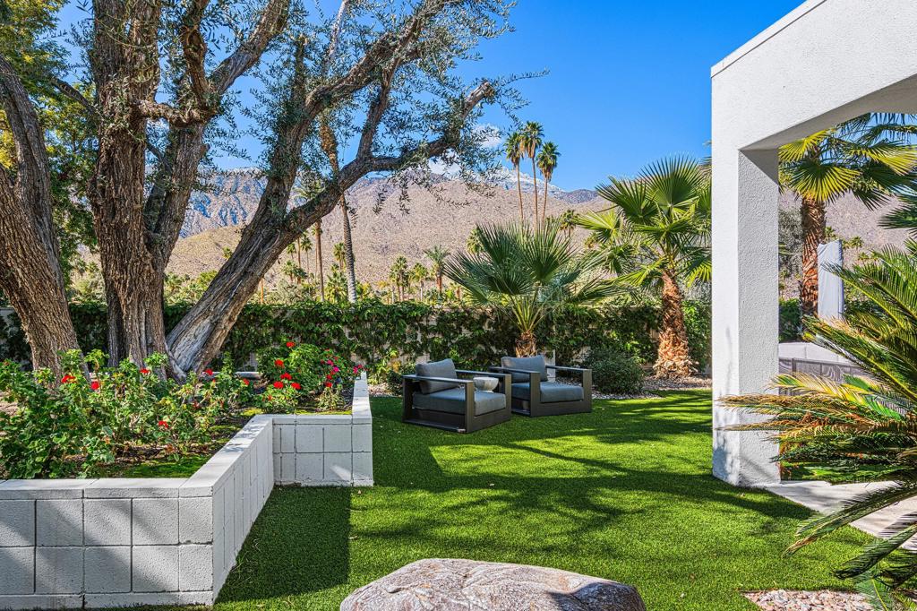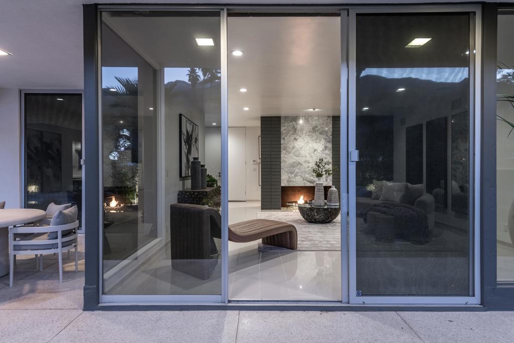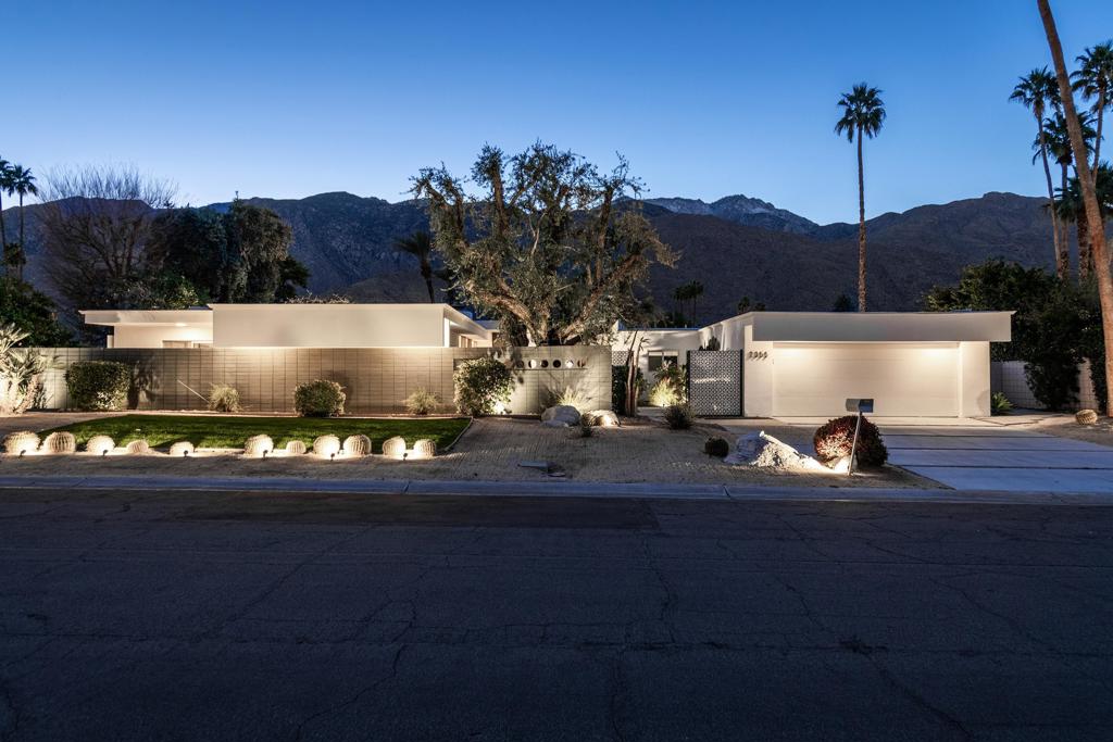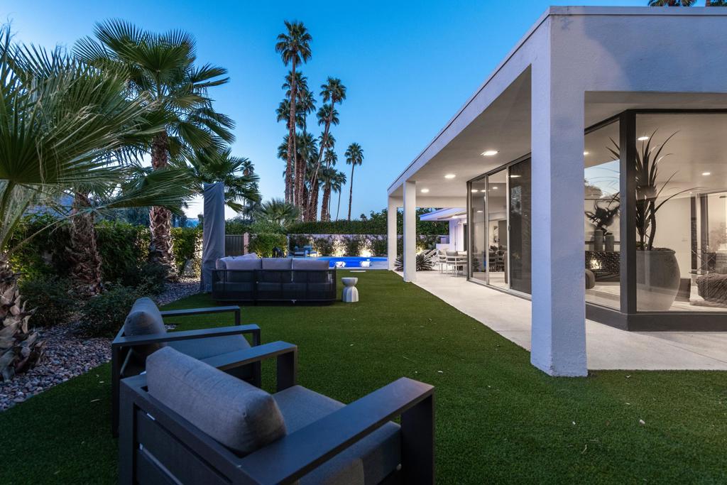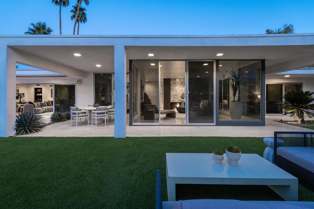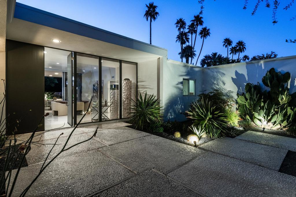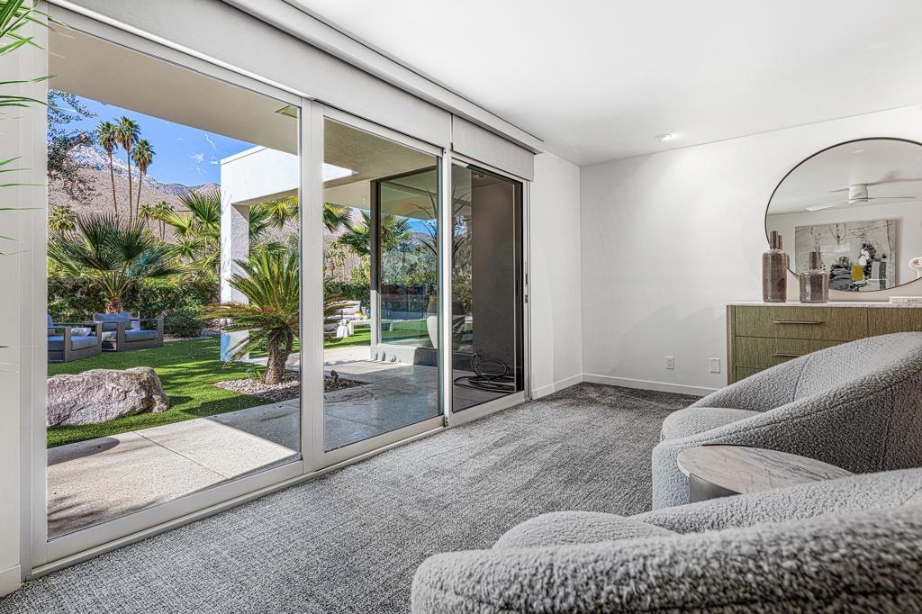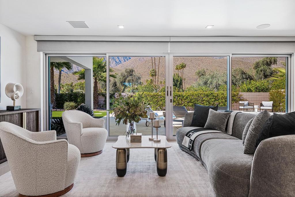 Nestled along the 17th fairway of the Indian Canyons Golf Course, this stunning mid-century modern home has undergone a meticulous transformation, blending timeless architecture with contemporary design and efficiency. Boasting west-facing views of the majestic San Jacinto Mountains, this approximately 2900-square-foot residence offers a seamless indoor-outdoor living experience. Upon entry, the floor-to-ceiling living room glass and terrazzo patios effortlessly capture the essence of its original design era. The all-new kitchen features quartz and marble countertops, sleek Italian design cabinetry, and top-of-the-line Miele and Wolf appliances, creating a culinary haven. The open concept kitchen/family room, adorned with expansive glass sliders, seamlessly connects to the backyard and pool, offering a perfect setting for relaxing and entertaining. The generously sized primary suite is accompanied by an oversized bath, complete with a freestanding tub and a luxurious oversized shower. An all-new outdoor shower adds a touch of indulgence to the outdoor experience. The outdoor space has been thoughtfully redesigned to include an outdoor barbecue and a drought-tolerant lawn, blending functionality with sustainable living. This home is equipped with a 36-panel owner-owned solar system, EV Charger station, tankless water heater, electric solar shades, and all-new heating and air conditioning, ensuring both energy efficiency and modern comfort.