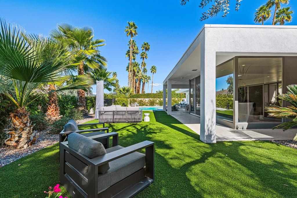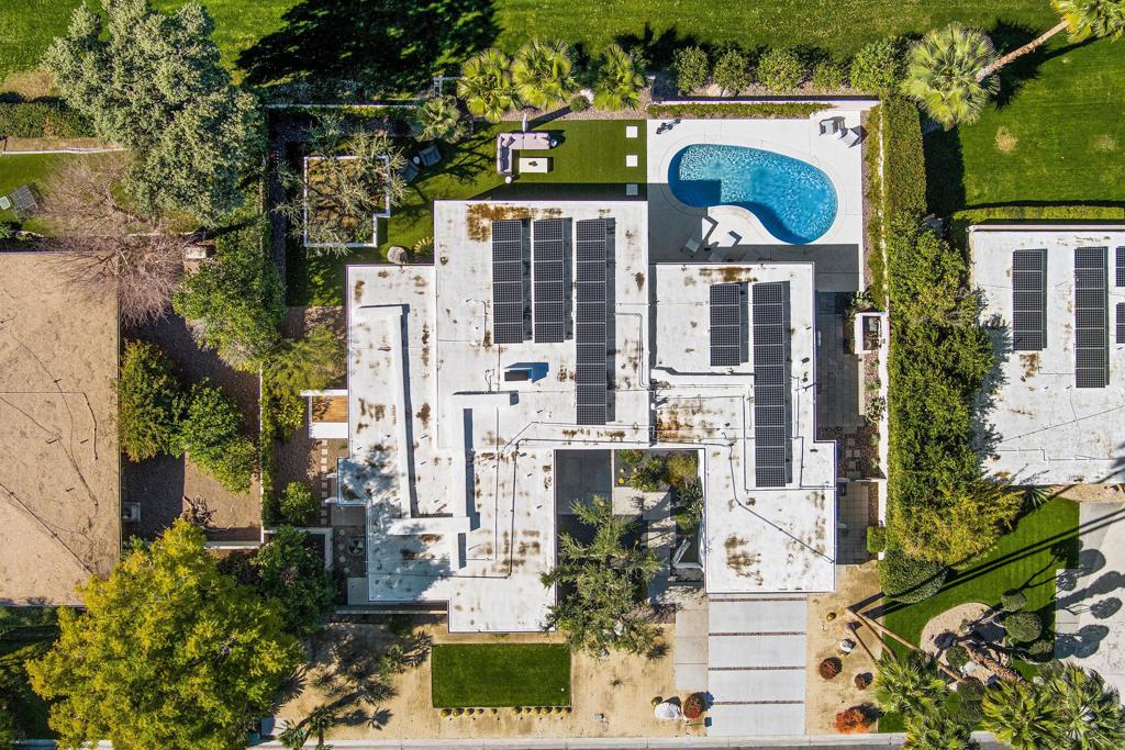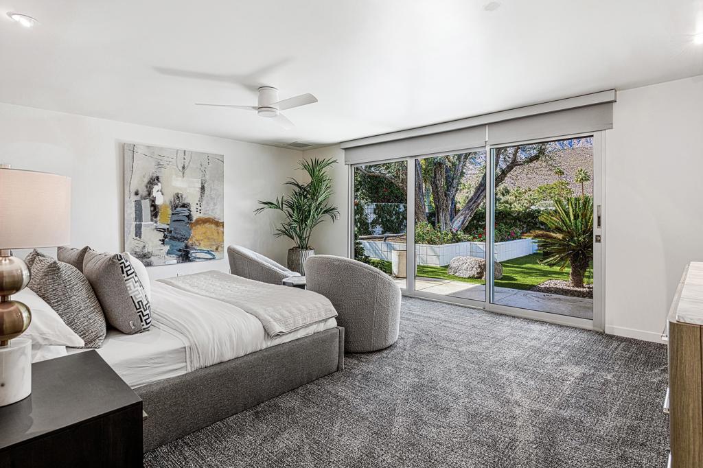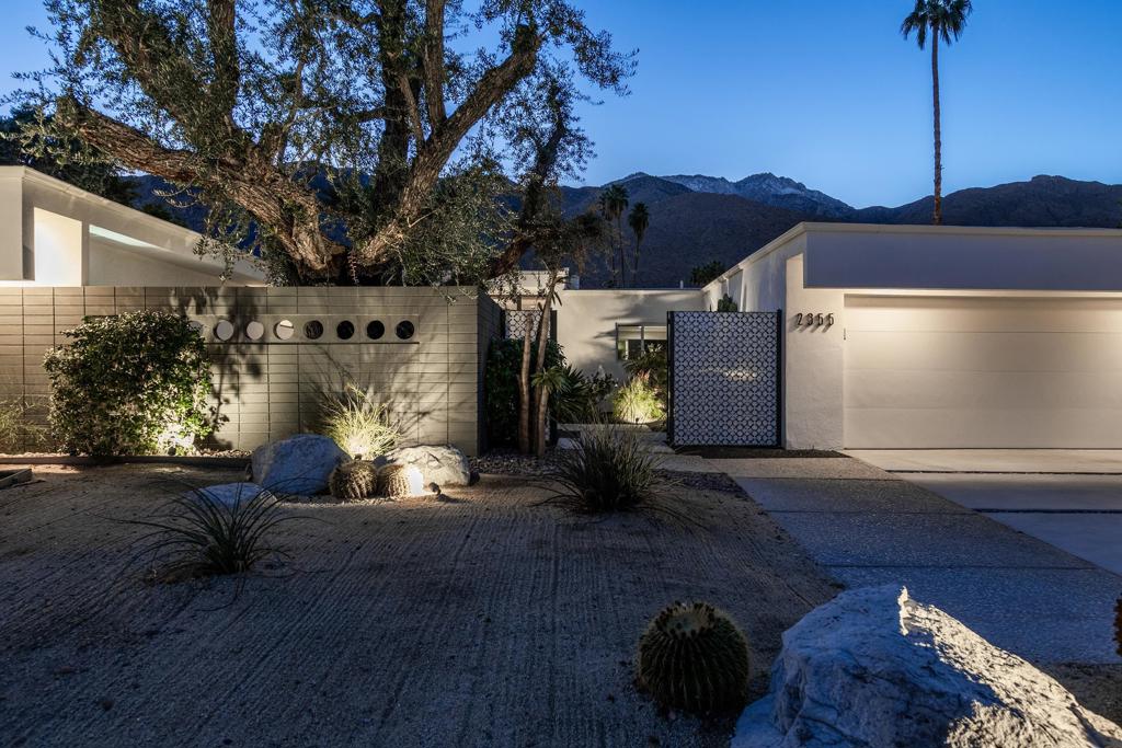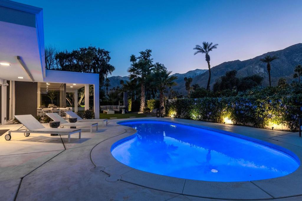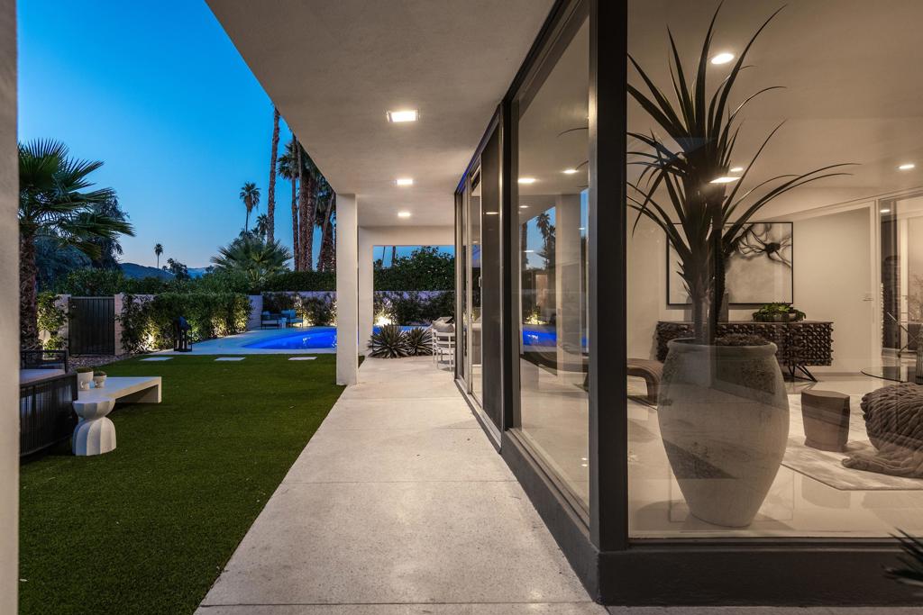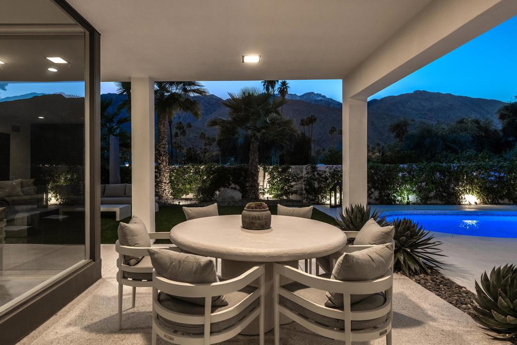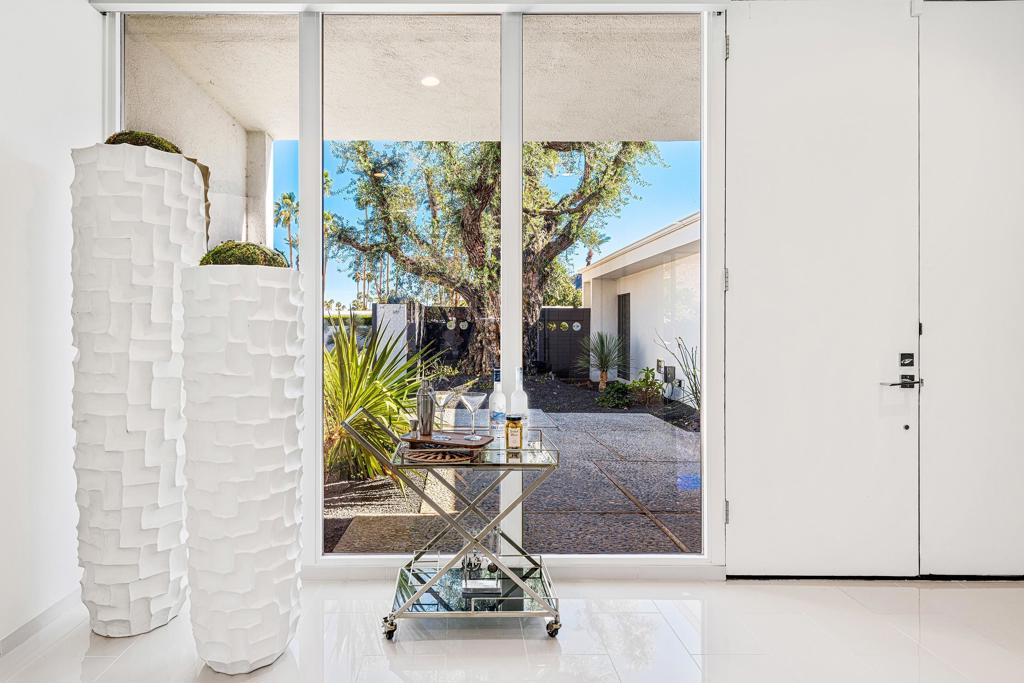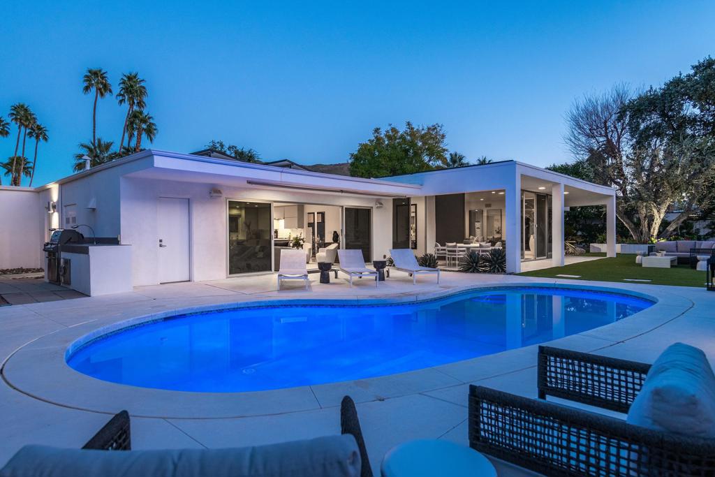 Nestled along the 17th fairway of the Indian Canyons Golf Course, this stunning mid-century modern home has undergone a meticulous transformation, blending timeless architecture with contemporary design and efficiency. Boasting west-facing views of the majestic San Jacinto Mountains, this approximately 2900-square-foot residence offers a seamless indoor-outdoor living experience. Upon entry, the floor-to-ceiling living room glass and terrazzo patios effortlessly capture the essence of its original design era. The all-new kitchen features quartz and marble countertops, sleek Italian design cabinetry, and top-of-the-line Miele and Wolf appliances, creating a culinary haven. The open concept kitchen/family room, adorned with expansive glass sliders, seamlessly connects to the backyard and pool, offering a perfect setting for relaxing and entertaining. The generously sized primary suite is accompanied by an oversized bath, complete with a freestanding tub and a luxurious oversized shower. An all-new outdoor shower adds a touch of indulgence to the outdoor experience. The outdoor space has been thoughtfully redesigned to include an outdoor barbecue and a drought-tolerant lawn, blending functionality with sustainable living. This home is equipped with a 36-panel owner-owned solar system, EV Charger station, tankless water heater, electric solar shades, and all-new heating and air conditioning, ensuring both energy efficiency and modern comfort.
