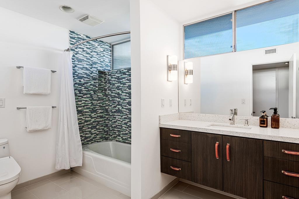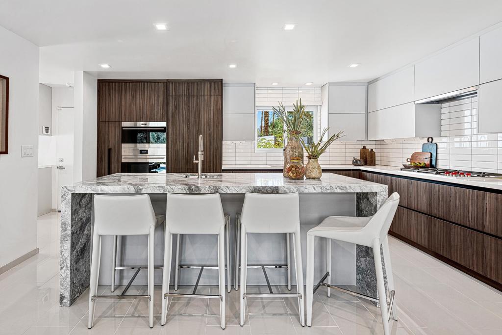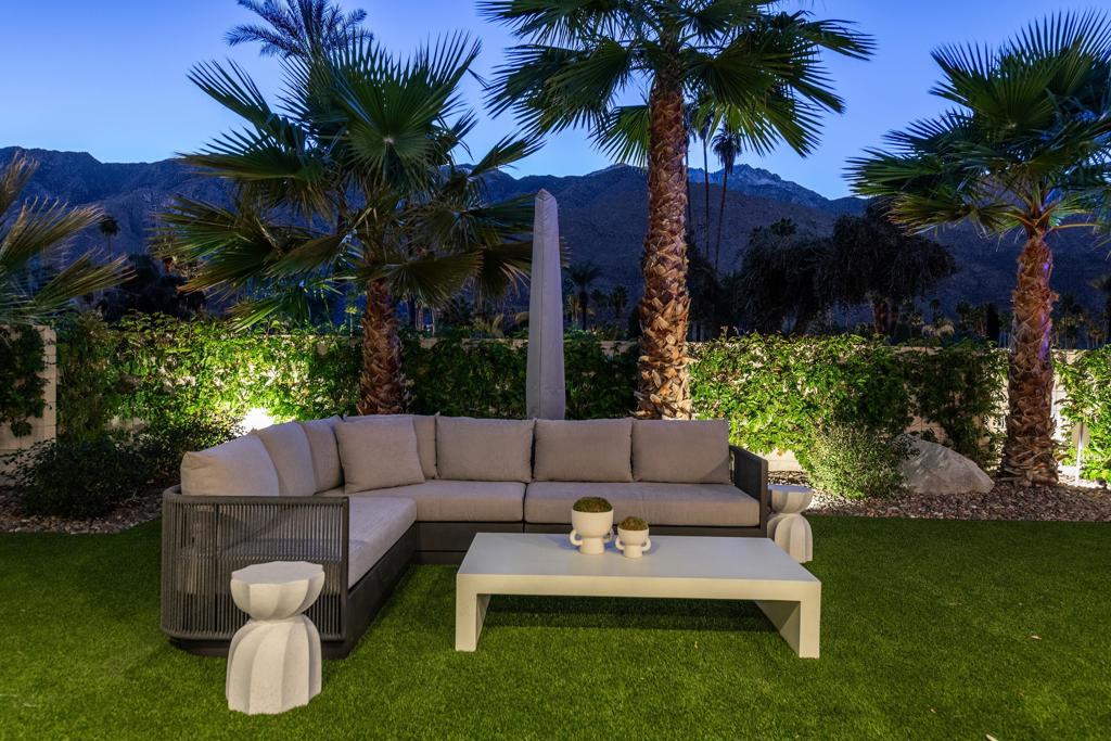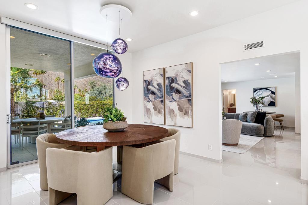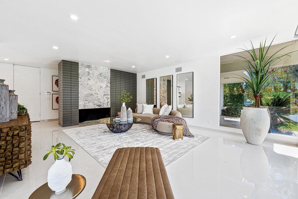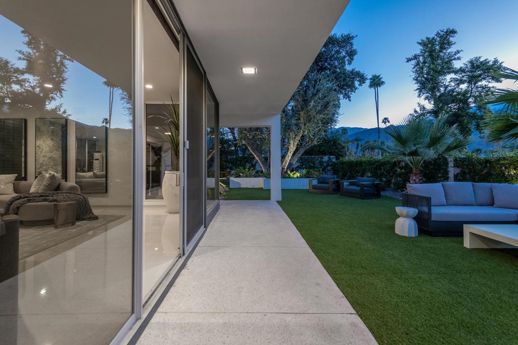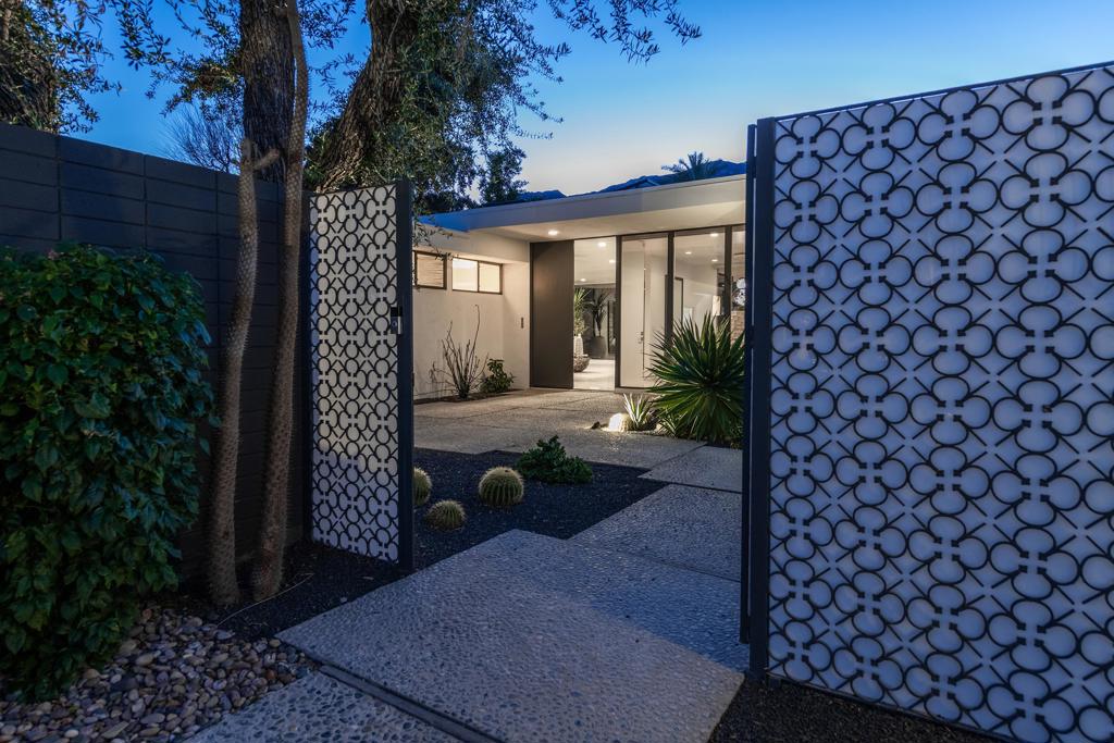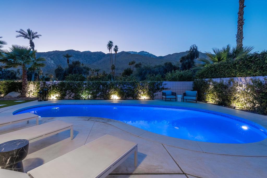 Nestled along the 17th fairway of the Indian Canyons Golf Course, this stunning mid-century modern home has undergone a meticulous transformation, blending timeless architecture with contemporary design and efficiency. Boasting west-facing views of the majestic San Jacinto Mountains, this approximately 2900-square-foot residence offers a seamless indoor-outdoor living experience. Upon entry, the floor-to-ceiling living room glass and terrazzo patios effortlessly capture the essence of its original design era. The all-new kitchen features quartz and marble countertops, sleek Italian design cabinetry, and top-of-the-line Miele and Wolf appliances, creating a culinary haven. The open concept kitchen/family room, adorned with expansive glass sliders, seamlessly connects to the backyard and pool, offering a perfect setting for relaxing and entertaining. The generously sized primary suite is accompanied by an oversized bath, complete with a freestanding tub and a luxurious oversized shower. An all-new outdoor shower adds a touch of indulgence to the outdoor experience. The outdoor space has been thoughtfully redesigned to include an outdoor barbecue and a drought-tolerant lawn, blending functionality with sustainable living. This home is equipped with a 36-panel owner-owned solar system, EV Charger station, tankless water heater, electric solar shades, and all-new heating and air conditioning, ensuring both energy efficiency and modern comfort.