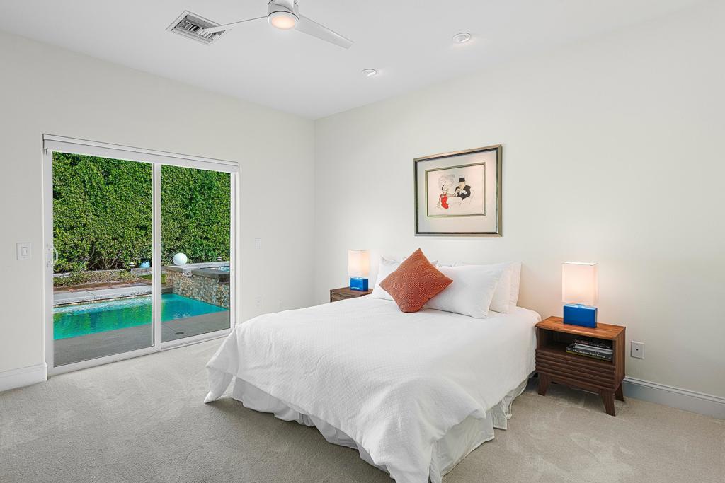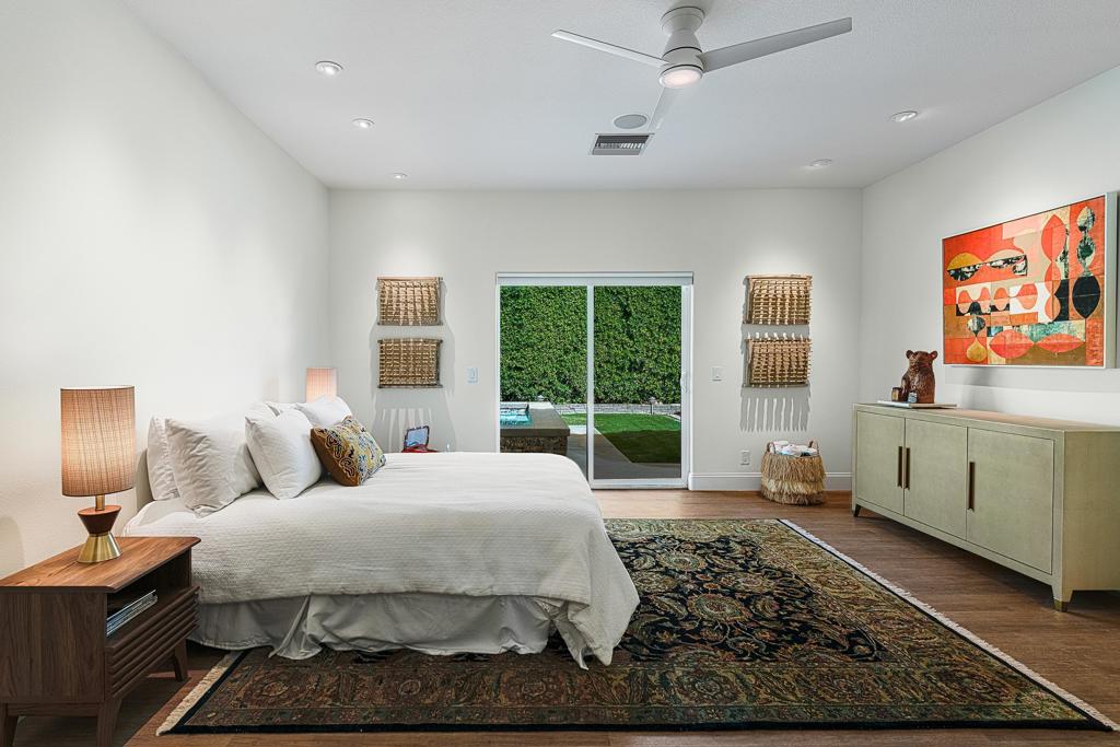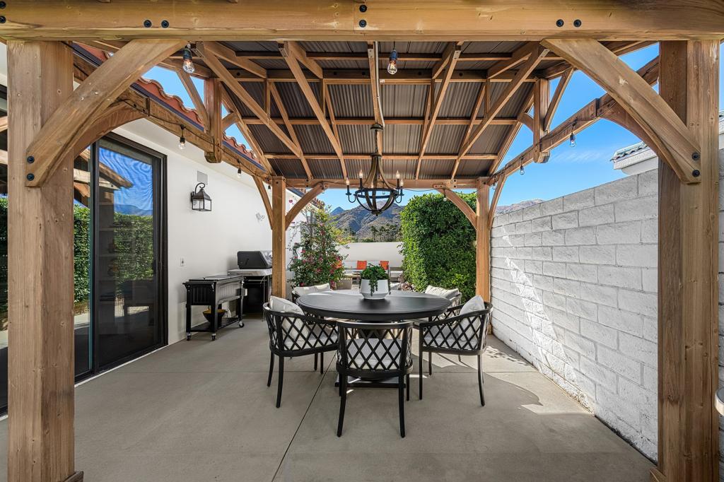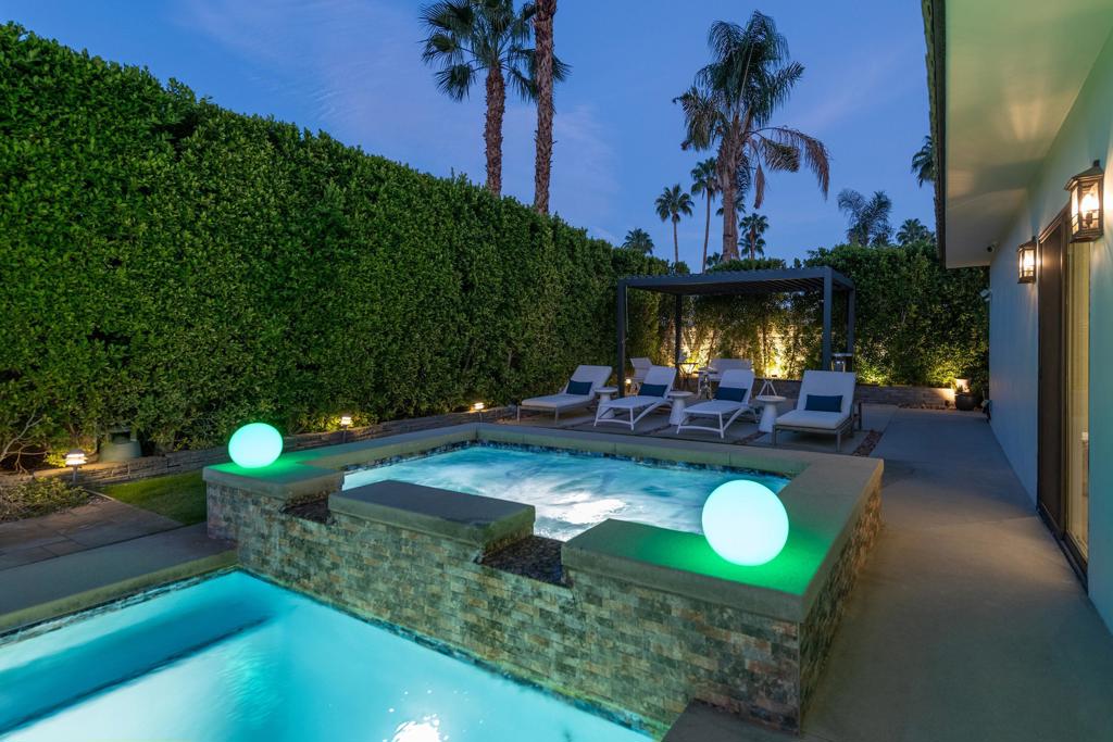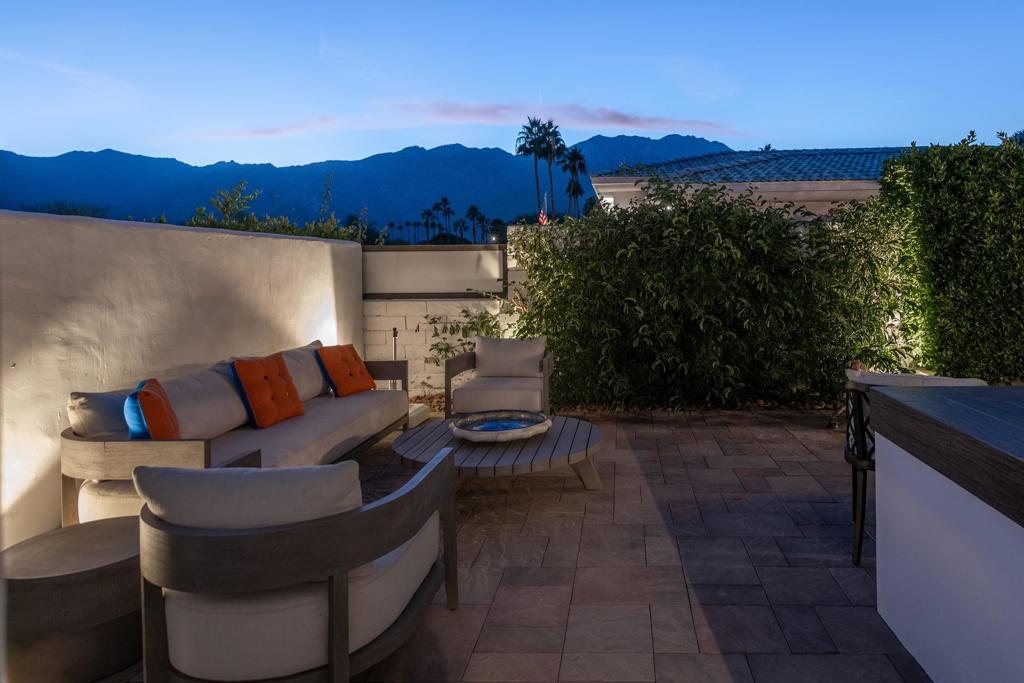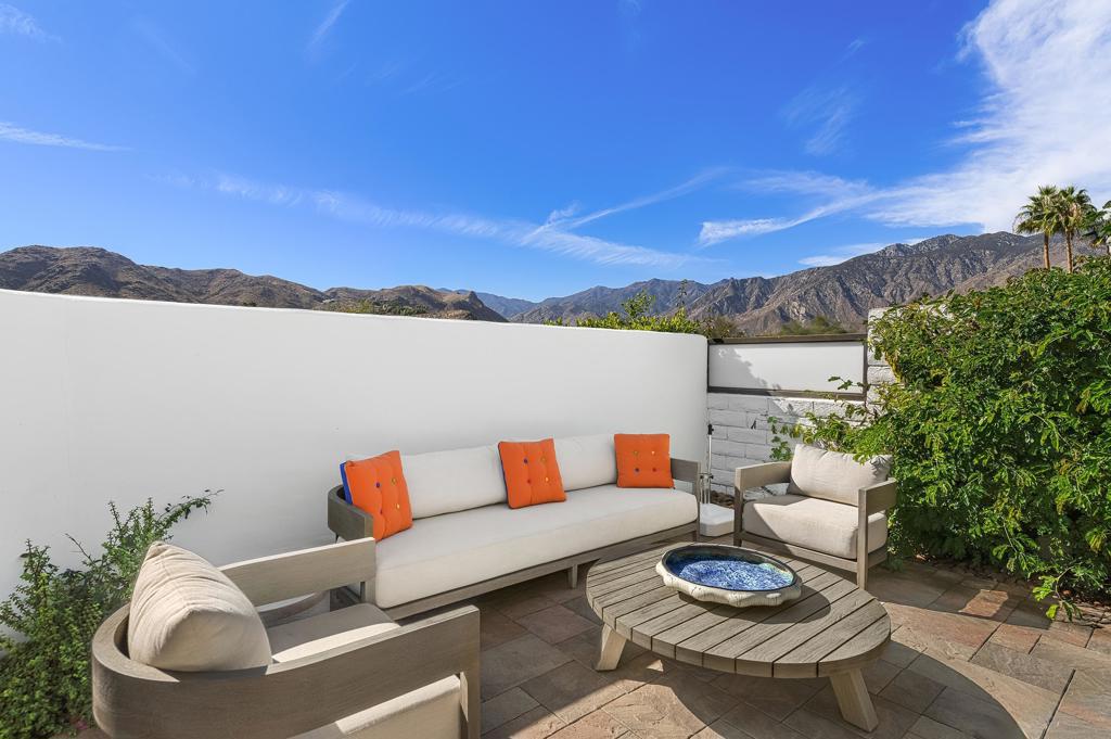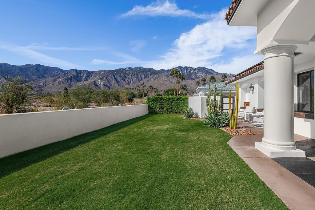 This exquisitely remodeled home in South Palm Springs offers a stunning blend of curated design and modern amenities for an unparalleled living experience. Extraordinary mountain views in every direction both inside and out. Enter through your grand double door entry where you are greeted with a striking stack stone wall. Step into a sophisticated yet cozy living area, perfect for unwinding with friends or simply savoring the stunning environment. The light filled kitchen and family room flow seamlessly into the dining room creating an open concept great for gatherings. The kitchen is equipped with quartz countertops, high end stainless appliances including stand-alone ice maker, wine cooler and beverage fridge and a strategically placed corner window that captures breathtaking views of the valley. Dual primary bedrooms on opposite sides of the home both with spa-like bathrooms and walk-in custom closets. A well-appointed guest bedroom, capable of hosting a king-sized bed, is conveniently located adjacent to a full bathroom, providing comfort and convenience for visitors. There is also a media room with built-ins to showcase all your collectables. The home is elevated from the street, and the entire property has been enclosed with tall walls and beautiful landscaping to create a resort-like vibe. The yard is an entertainer's dream with a newer saltwater pool, raised spa, covered pavilion and fire pit for cool winter nights. There is also a large side yard with outdoor dining and a front patio with some of the best views around, Newly installed 42 owned solar panels and 3 tesla backup batteries ensure low utilities and power during an emergency. Sitting in the heart of South Palm Springs on a quiet cul-de-sac this home has it all! No HOA and you own the land.