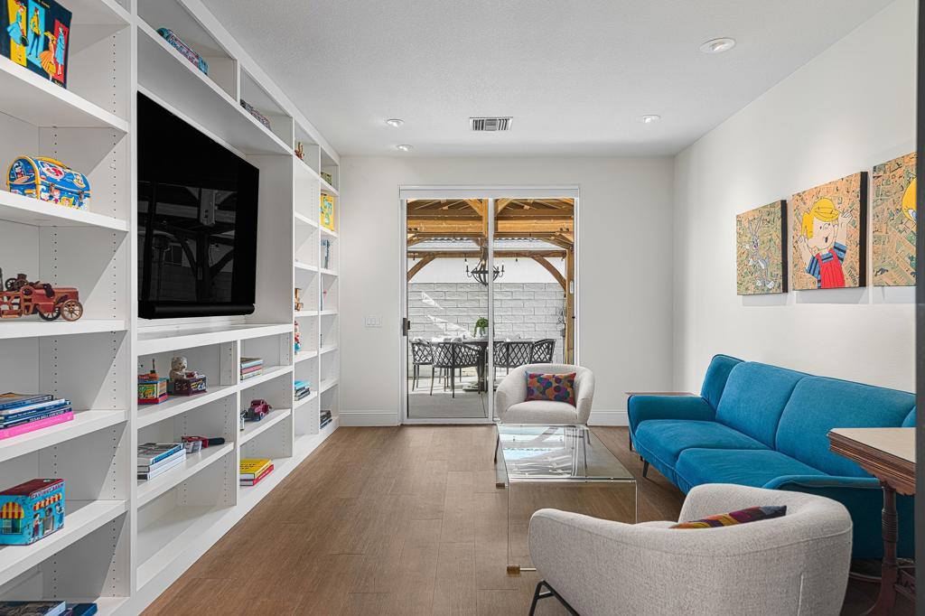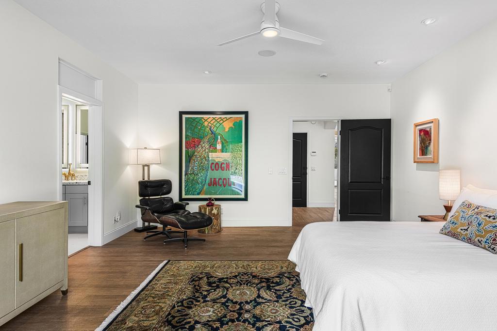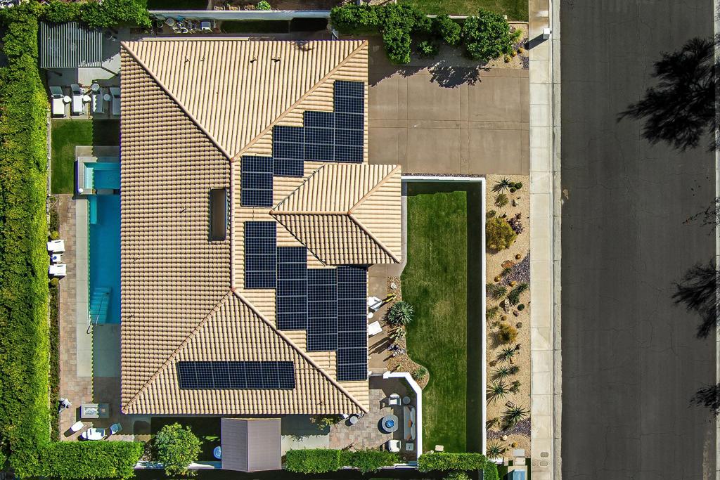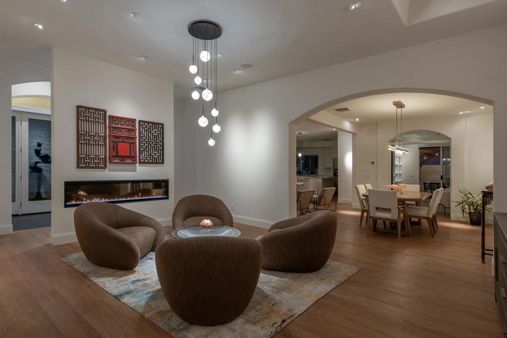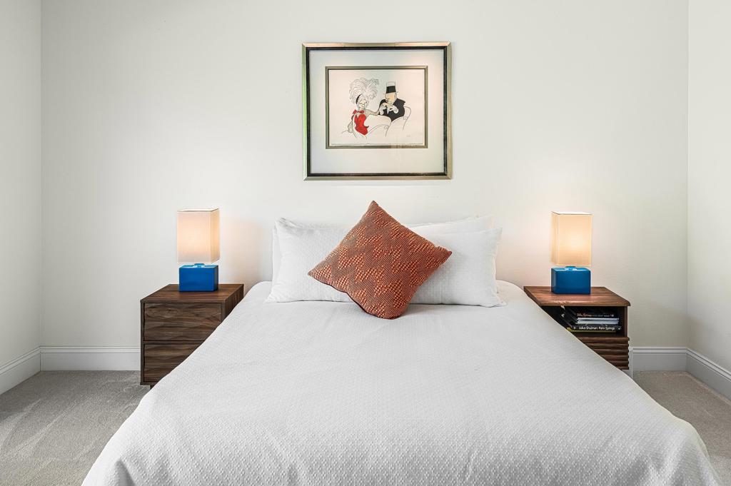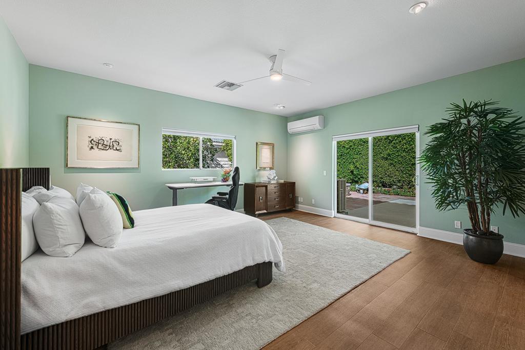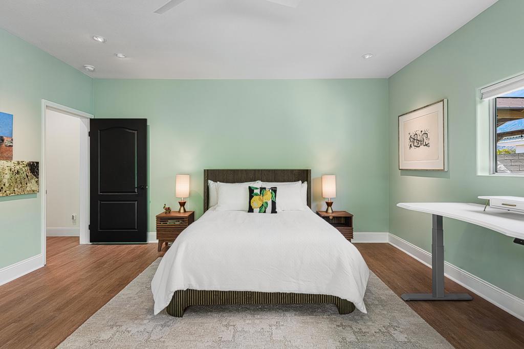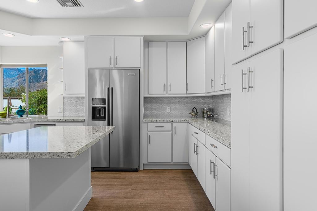 This exquisitely remodeled home in South Palm Springs offers a stunning blend of curated design and modern amenities for an unparalleled living experience. Extraordinary mountain views in every direction both inside and out. Enter through your grand double door entry where you are greeted with a striking stack stone wall. Step into a sophisticated yet cozy living area, perfect for unwinding with friends or simply savoring the stunning environment. The light filled kitchen and family room flow seamlessly into the dining room creating an open concept great for gatherings. The kitchen is equipped with quartz countertops, high end stainless appliances including stand-alone ice maker, wine cooler and beverage fridge and a strategically placed corner window that captures breathtaking views of the valley. Dual primary bedrooms on opposite sides of the home both with spa-like bathrooms and walk-in custom closets. A well-appointed guest bedroom, capable of hosting a king-sized bed, is conveniently located adjacent to a full bathroom, providing comfort and convenience for visitors. There is also a media room with built-ins to showcase all your collectables. The home is elevated from the street, and the entire property has been enclosed with tall walls and beautiful landscaping to create a resort-like vibe. The yard is an entertainer's dream with a newer saltwater pool, raised spa, covered pavilion and fire pit for cool winter nights. There is also a large side yard with outdoor dining and a front patio with some of the best views around, Newly installed 42 owned solar panels and 3 tesla backup batteries ensure low utilities and power during an emergency. Sitting in the heart of South Palm Springs on a quiet cul-de-sac this home has it all! No HOA and you own the land.