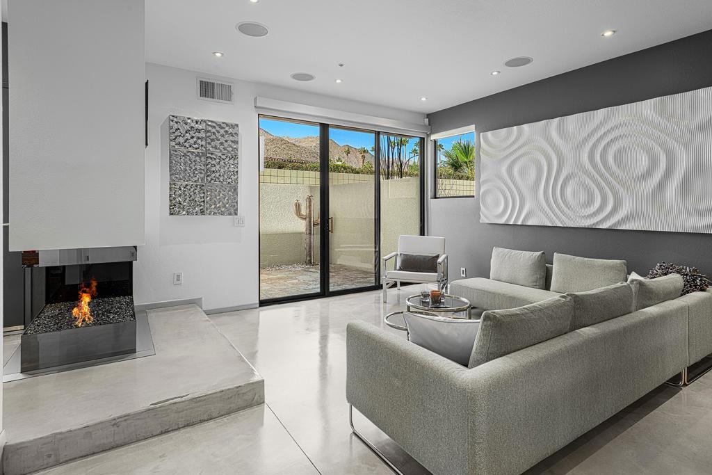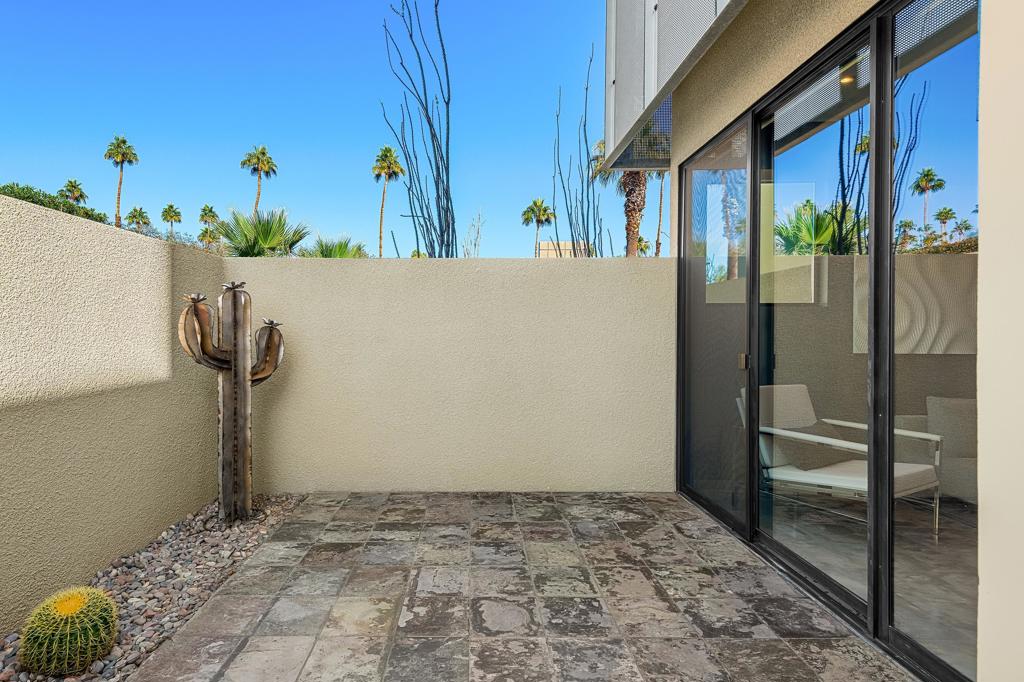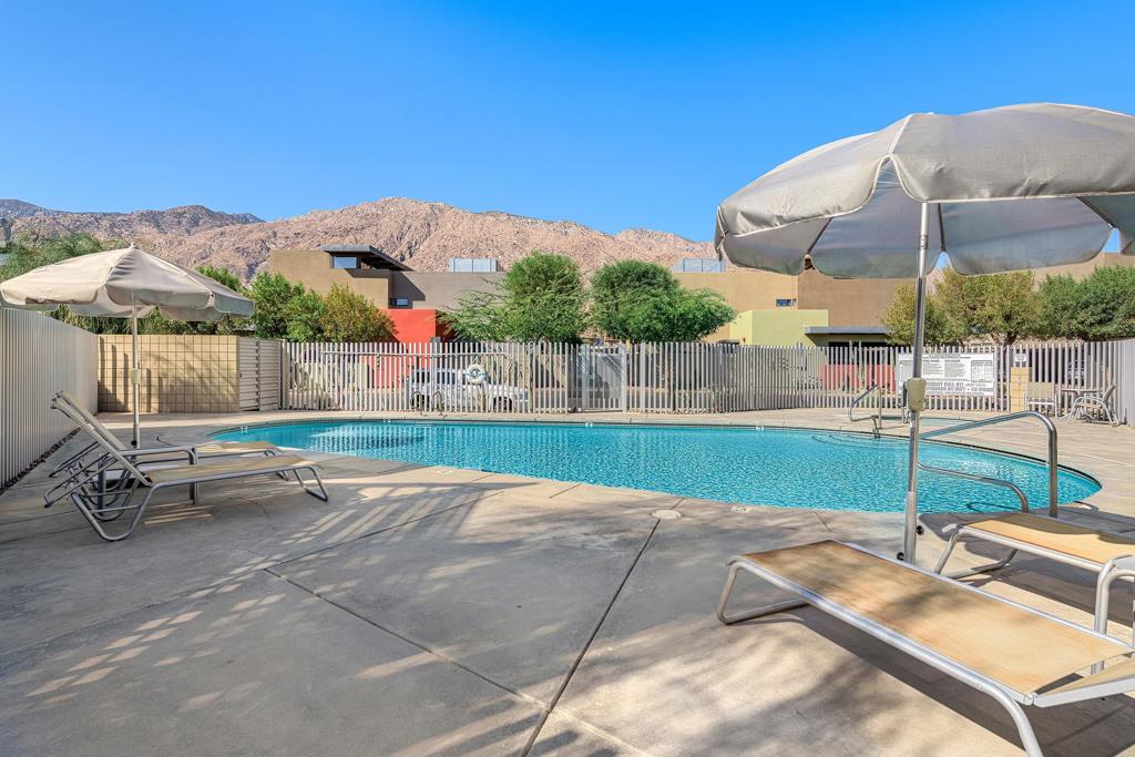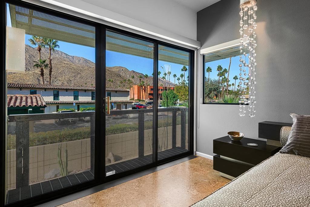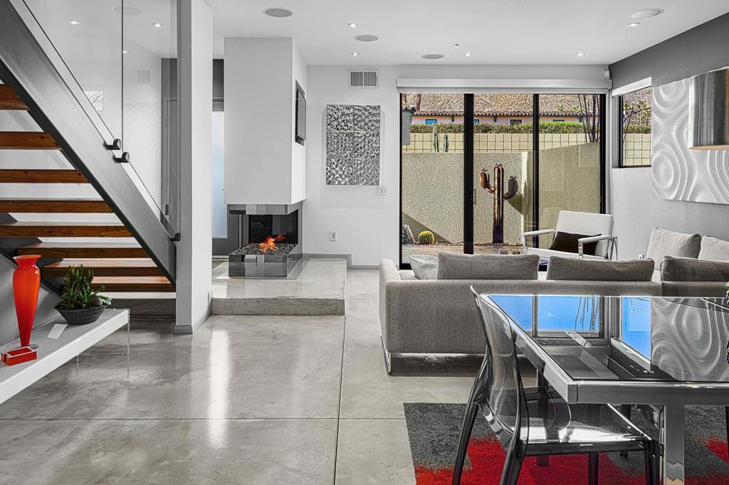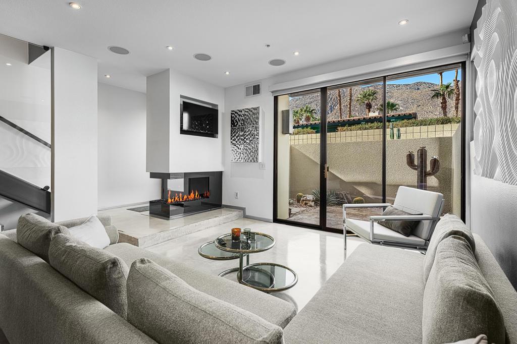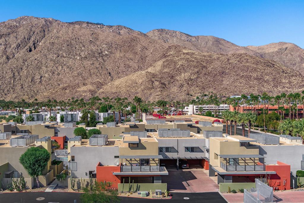 Welcome to designer-inspired townhouse-style living in the modern, gated community of 48@Arenas. This chic 2-bedroom, 2.5-bathroom condo spans 1,596 square feet and offers a perfect blend of urban aesthetic and desert tranquility. Located just a short stroll from the vibrant heart of Downtown Palm Springs, you'll have easy access to dining, retail, the Arenas District, Agua Caliente Casino, and the new Spa and Museum.Step inside to discover a splendid interior design featuring a spacious layout with high ceilings, polished concrete floors, a stylish fireplace, and an open-concept living, dining, and kitchen area. The private patio provides an ideal setting for entertaining or enjoying a quiet moment outdoors. The modern kitchen boasts granite counters and stainless steel appliances, complemented by a convenient stackable in-unit washer/dryer.Upstairs, you'll find two expansive primary suites, each with cork flooring, an abundant closet space, and its own en-suite bath. The primary bedroom features sliders and wrap-around windows that open to a balcony with incredible mountain views.This unit includes a dedicated covered parking space, and the community offers four pools and spas for your enjoyment. With fee-simple land and no lease payment, HOA dues cover earthquake insurance, water, and trash. Furnishings available outside of escrow.